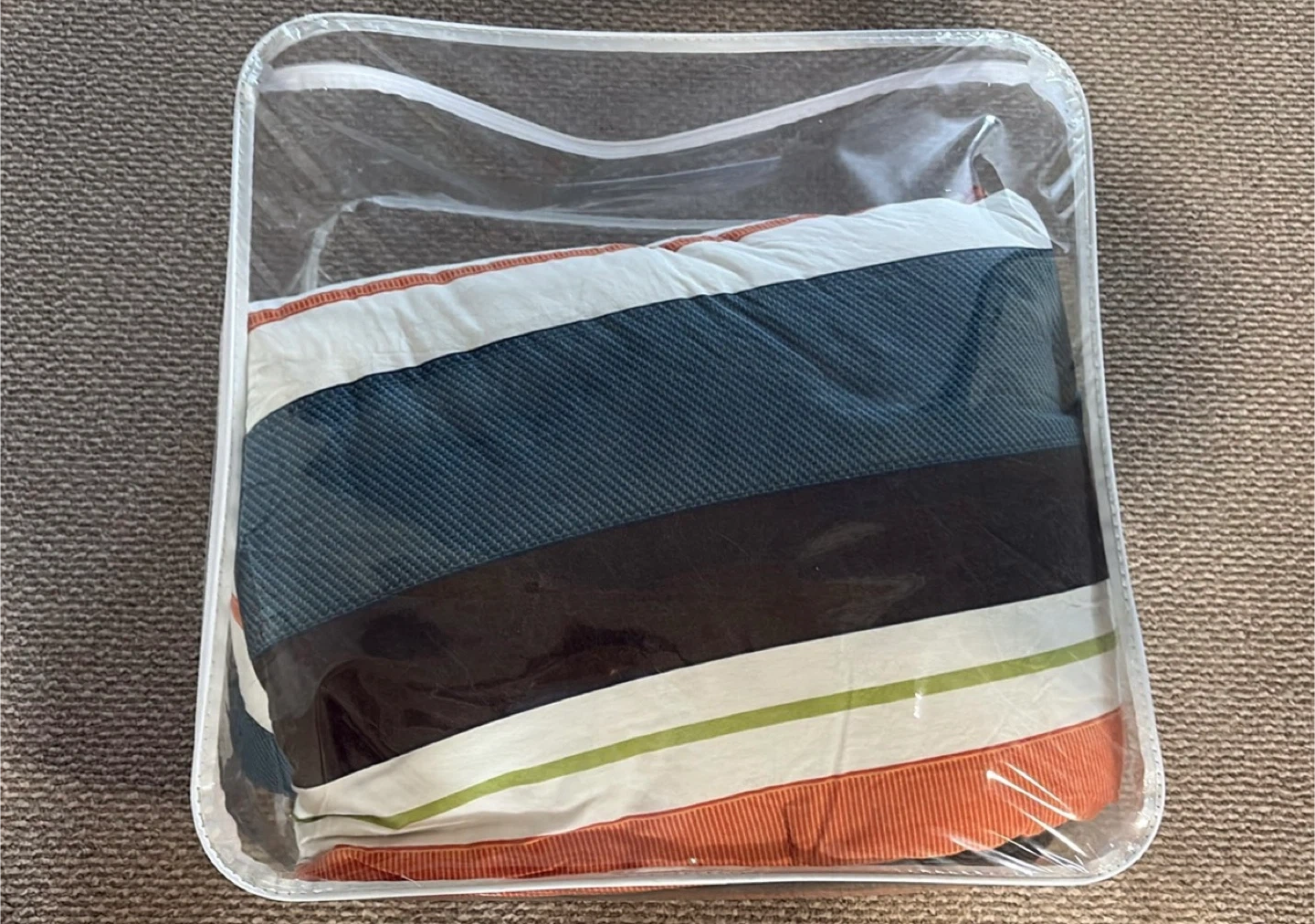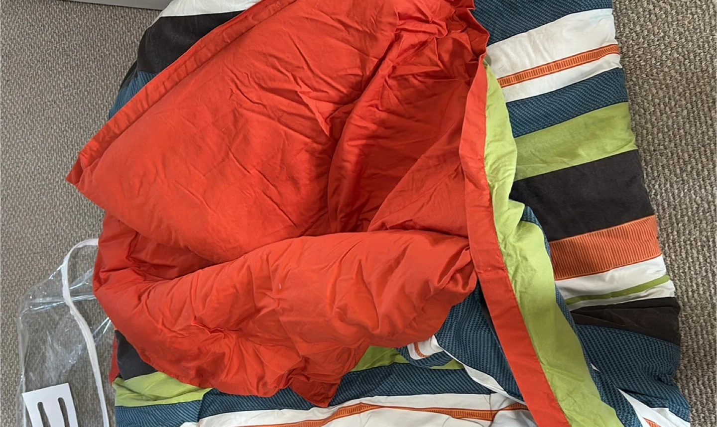 Here's a Double comforter set. That is reversible, one side with the stripes the other side, a beautiful orange . It's in good condition and comes in a clear plastic zippered bag for easy storage.