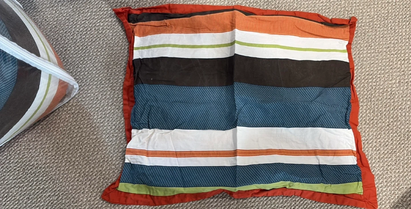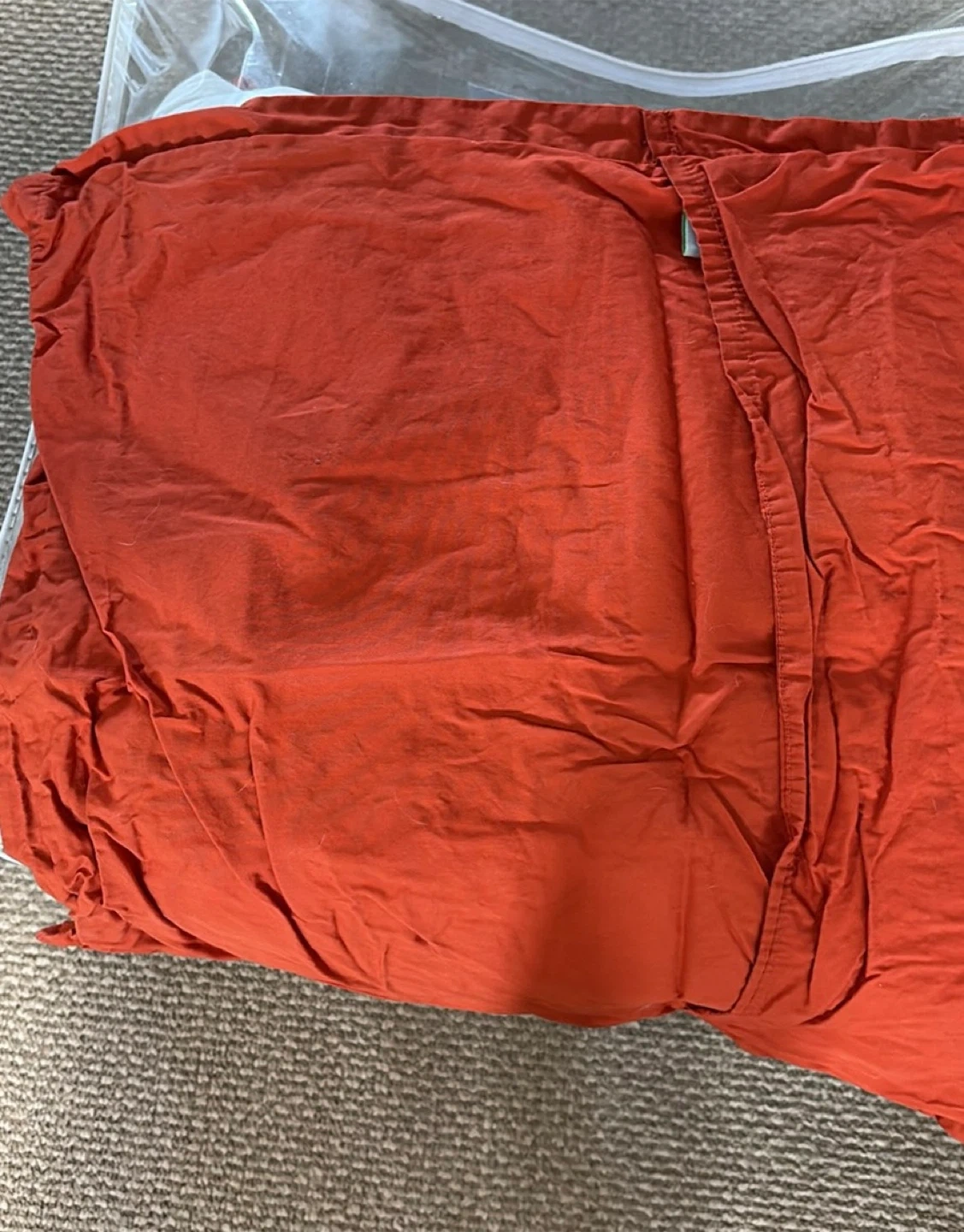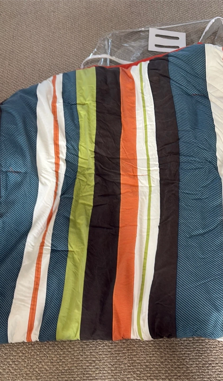 Here's a Double comforter set. That is reversible, one side with the stripes the other side, a beautiful orange . It's in good condition and comes in a clear plastic zippered bag for easy storage.