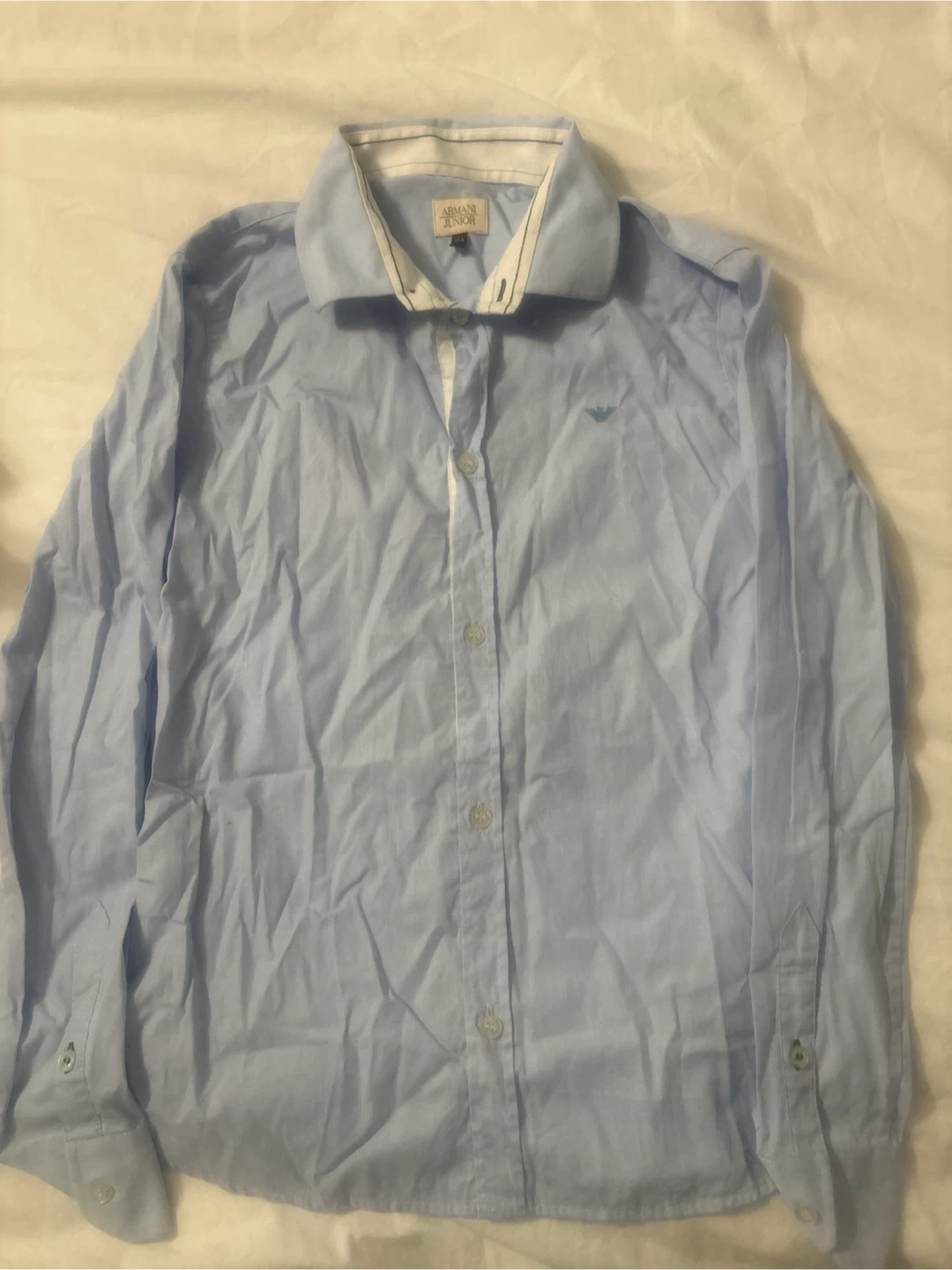 Here's a gently used Armani Junior long-sleeved shirt in a light blue colour. It's size 12A and would be great for a your young son