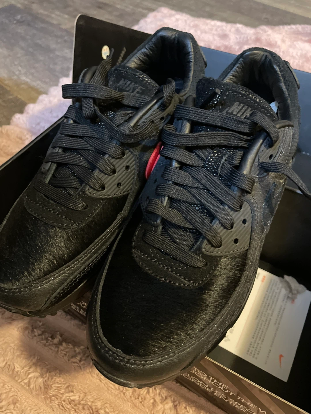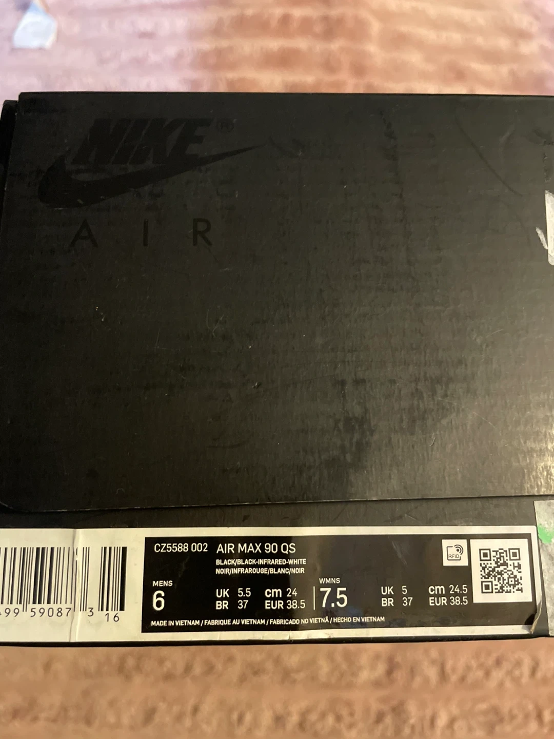 Selling a pair of Nike Air Max 90 QS sneakers in black and infrared. These are men's size 6, which is equivalent to a women's size 7.5. They come with the original box.