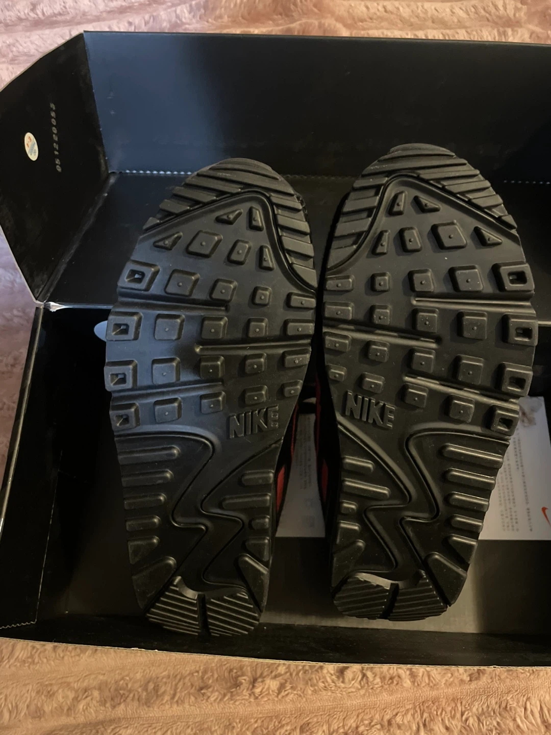 Selling a pair of Nike Air Max 90 QS sneakers in black and infrared. These are men's size 6, which is equivalent to a women's size 7.5. They come with the original box.