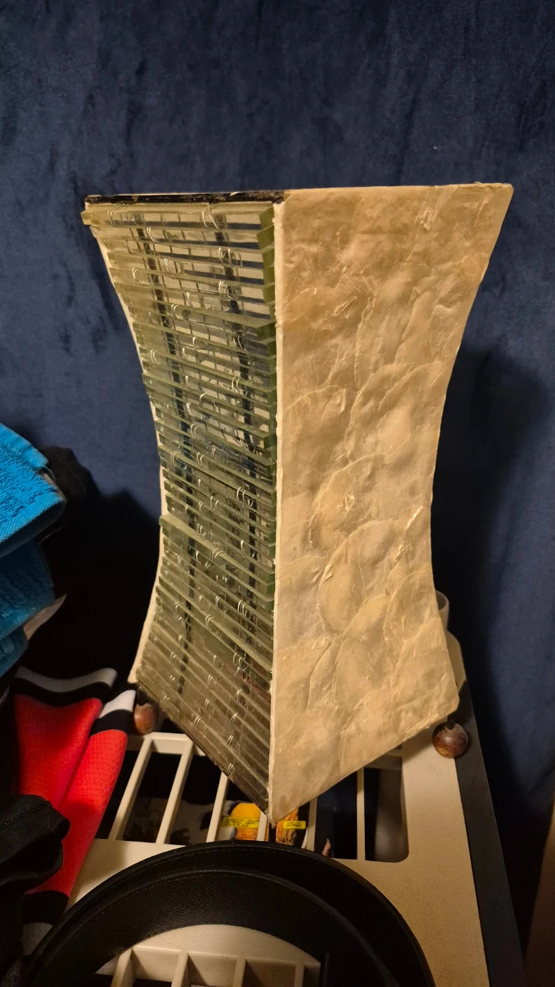 This is a unique decorative lamp featuring a layered glass design on one side and a faux stone finish on the other. It's a great piece to add some visual interest to any room!