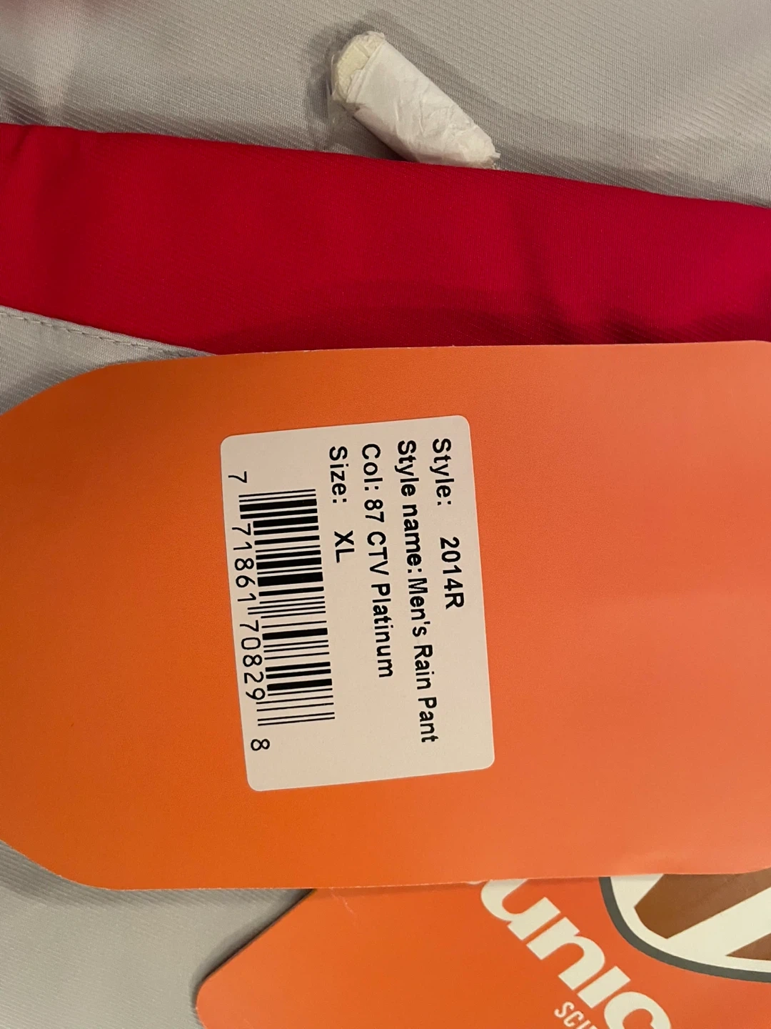 Selling a pair of Sunice Men's Rain Pants in size XL. The style number is 2014R, and the colour is 87 CTV/Platinum. Great for outdoor activities!