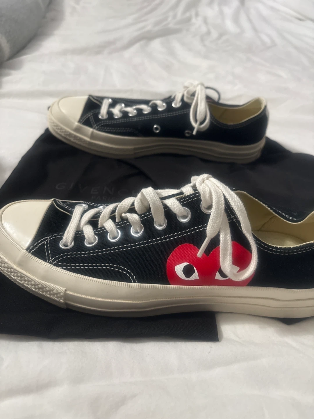 Selling a pair of Converse x Comme des Garçons PLAY sneakers! These black low-tops feature the iconic red heart logo. They are brand new and ready for a new owner