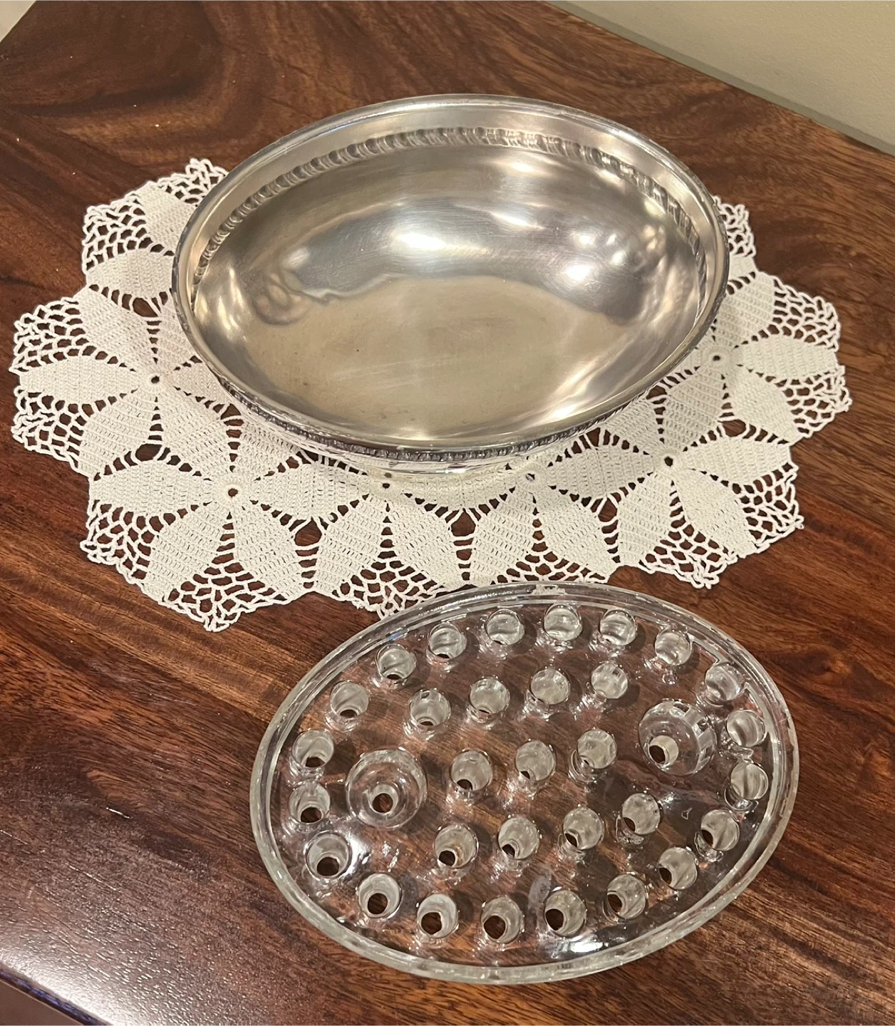 Silverplated oval bowl with clear removable glass insert