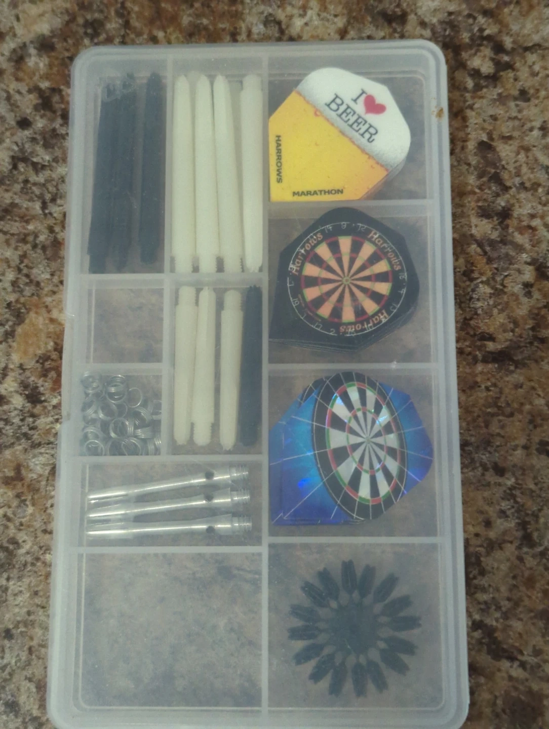 Selling a kit of dart accessories. Includes dart flights, shafts, and other small parts. Great for anyone who plays darts and needs replacement parts or wants to customize their darts.As is.