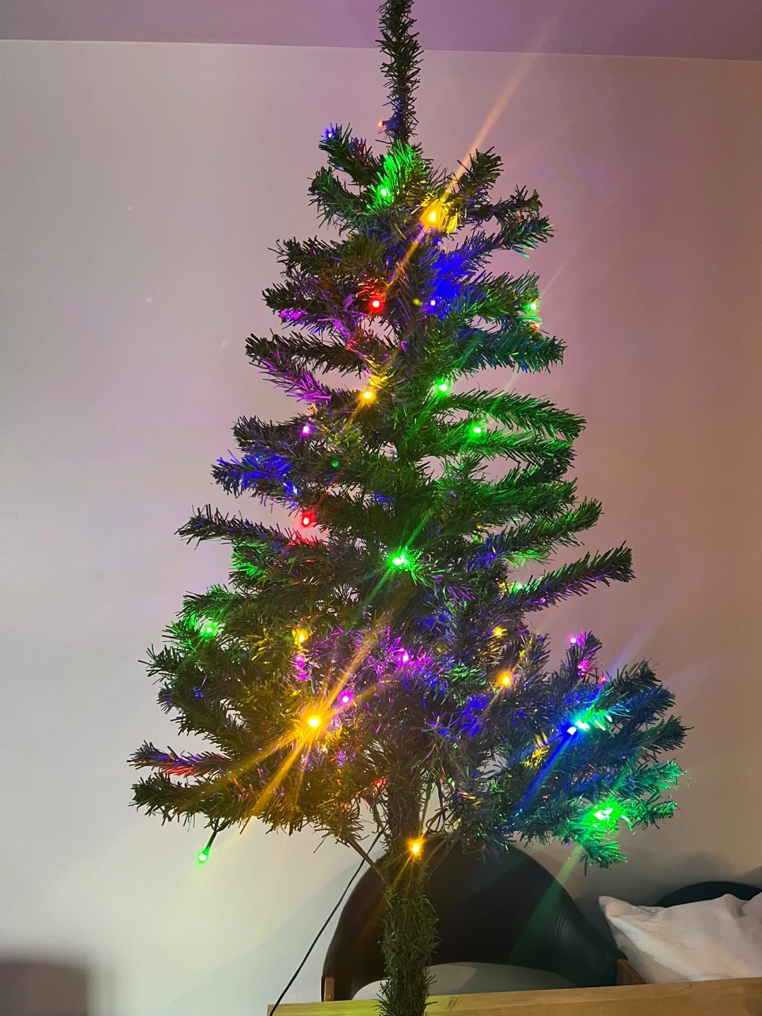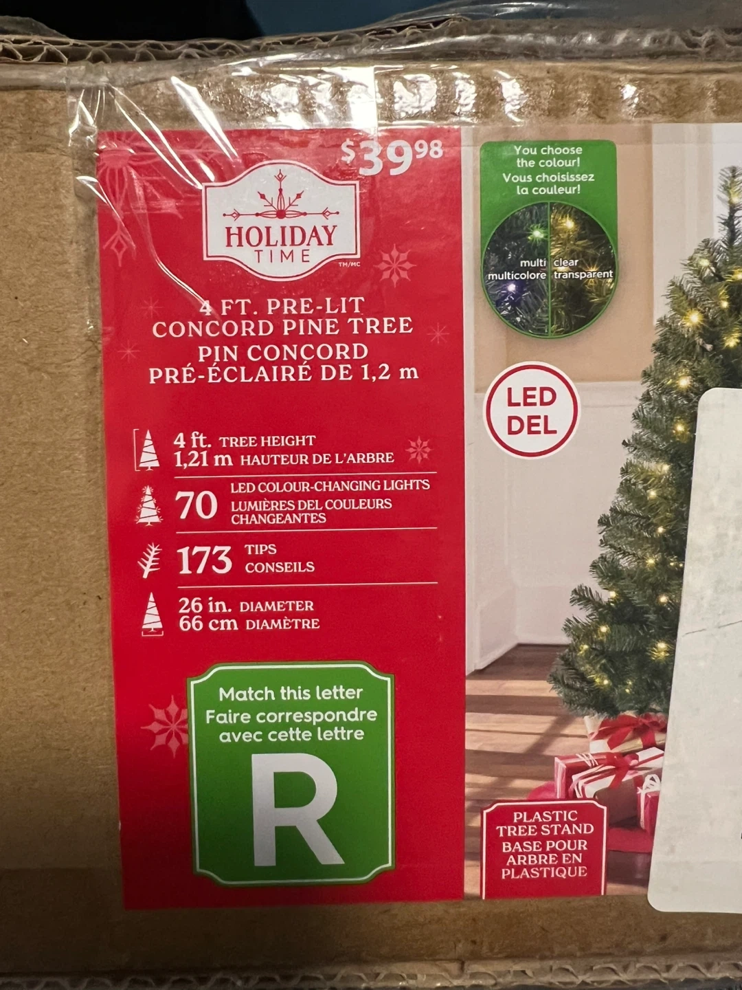 Selling a Holiday Time 4ft Concord Pre-Lit Pine Tree! It features colour-changing LED lights and is easy to set up. It's 4 ft tall (1.21 m) and 26 inches in diameter (66 cm). Originally bought for $39.98. Comes with a plastic tree stand and an indoor adapter