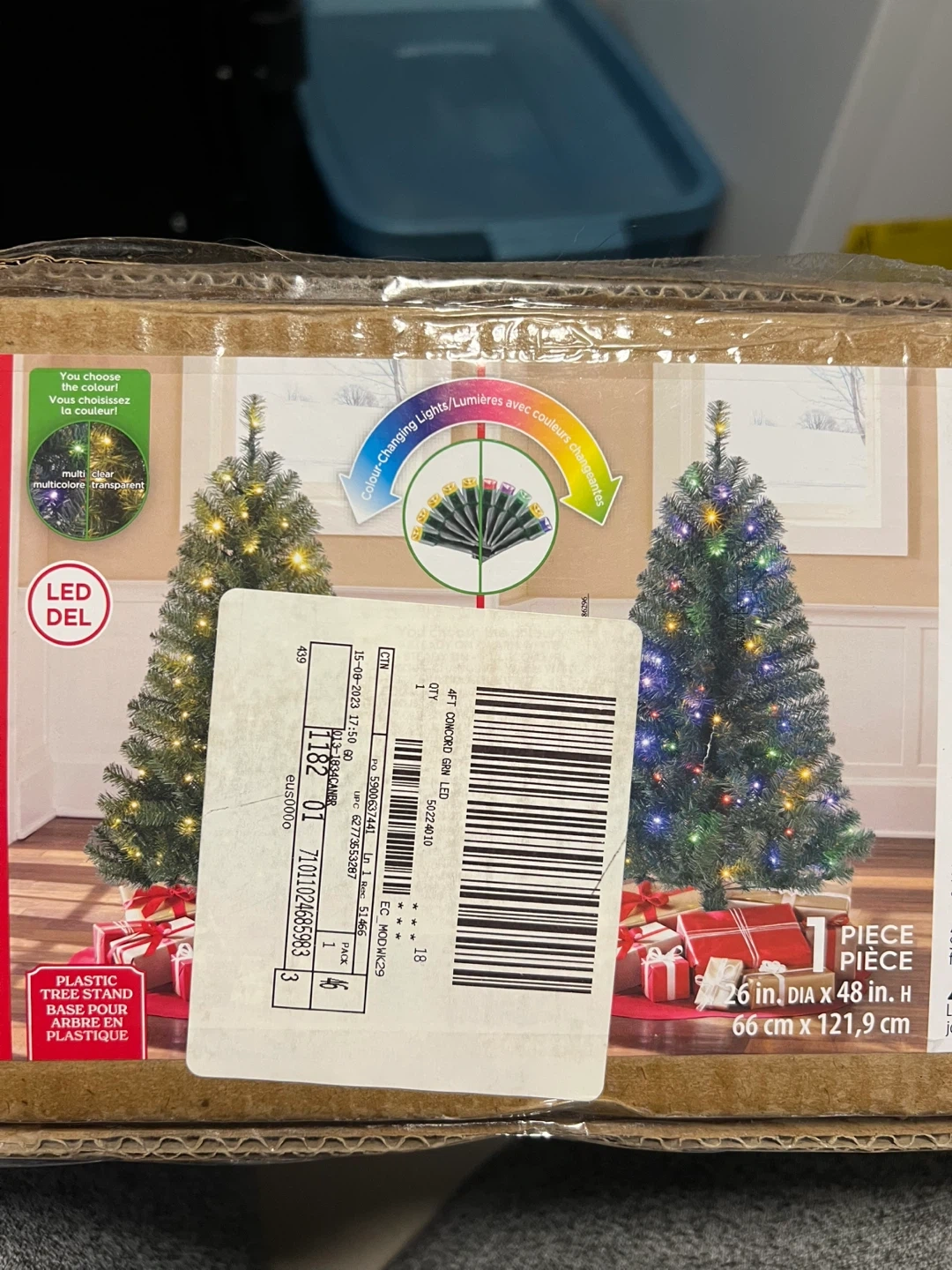 Selling a Holiday Time 4ft Concord Pre-Lit Pine Tree! It features colour-changing LED lights and is easy to set up. It's 4 ft tall (1.21 m) and 26 inches in diameter (66 cm). Originally bought for $39.98. Comes with a plastic tree stand and an indoor adapter