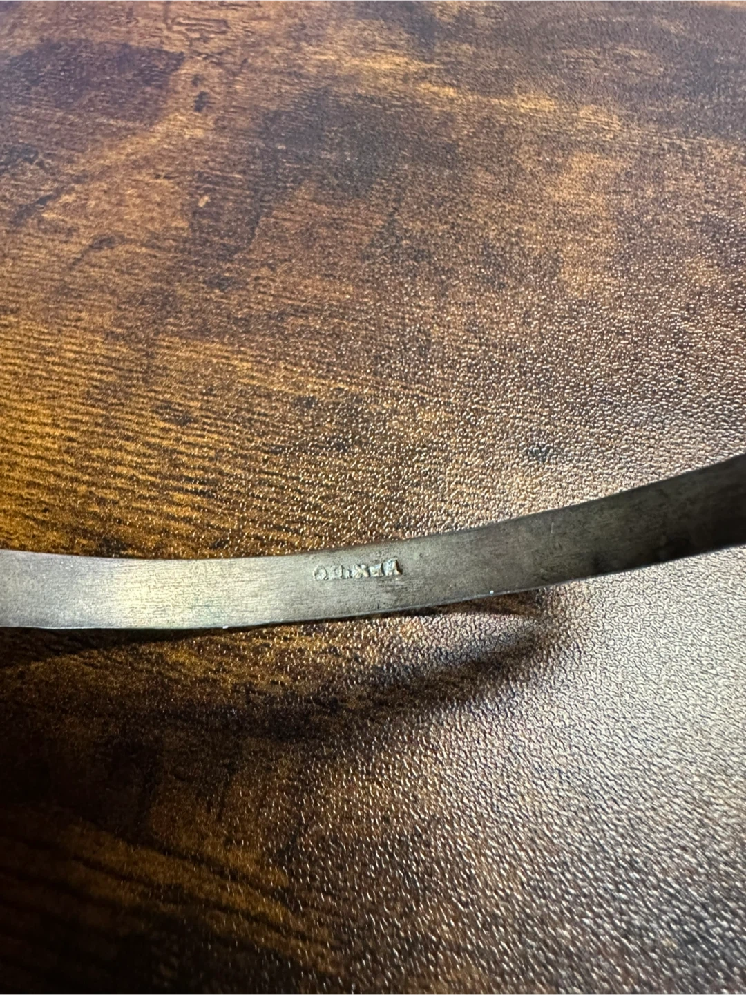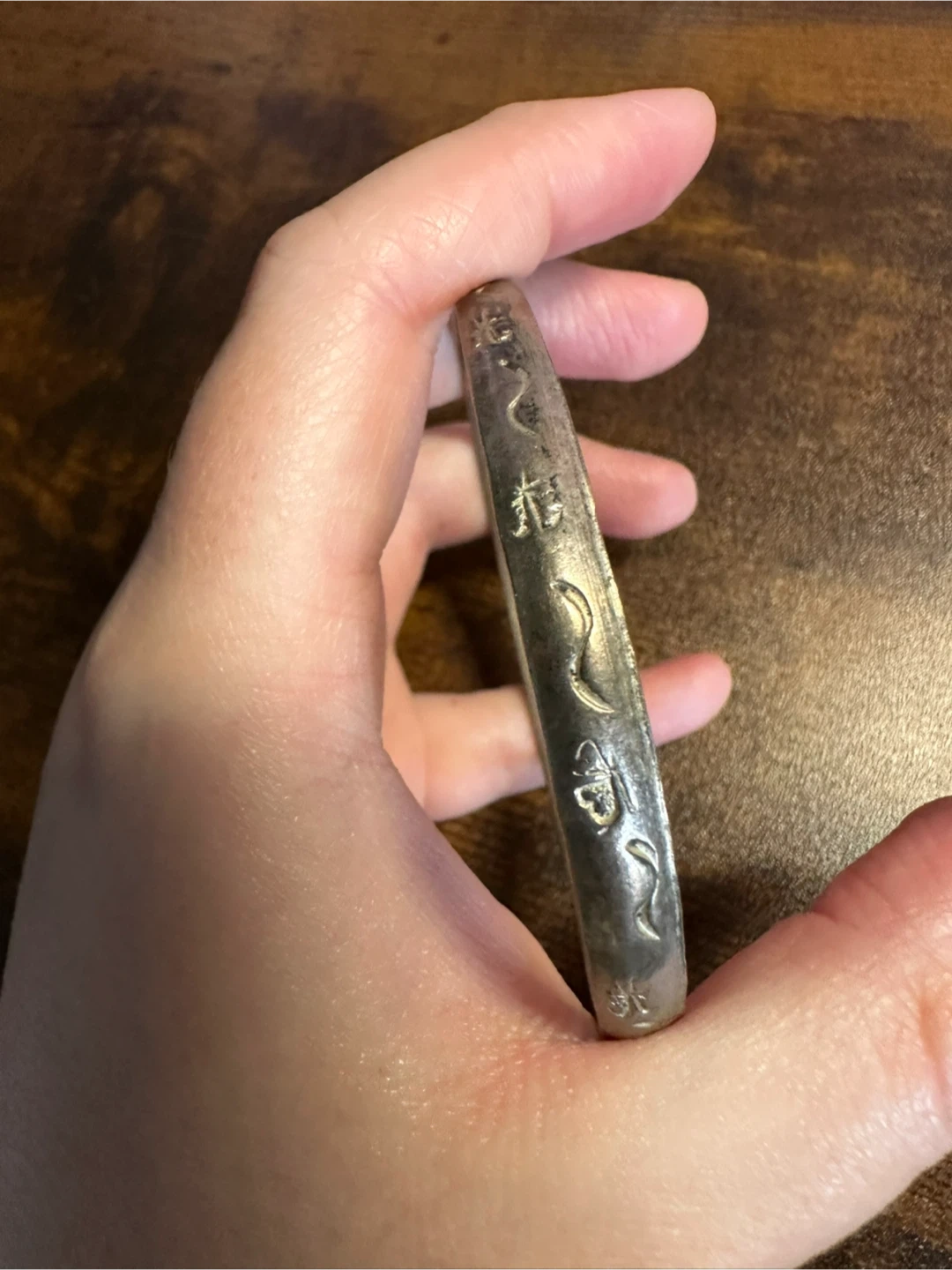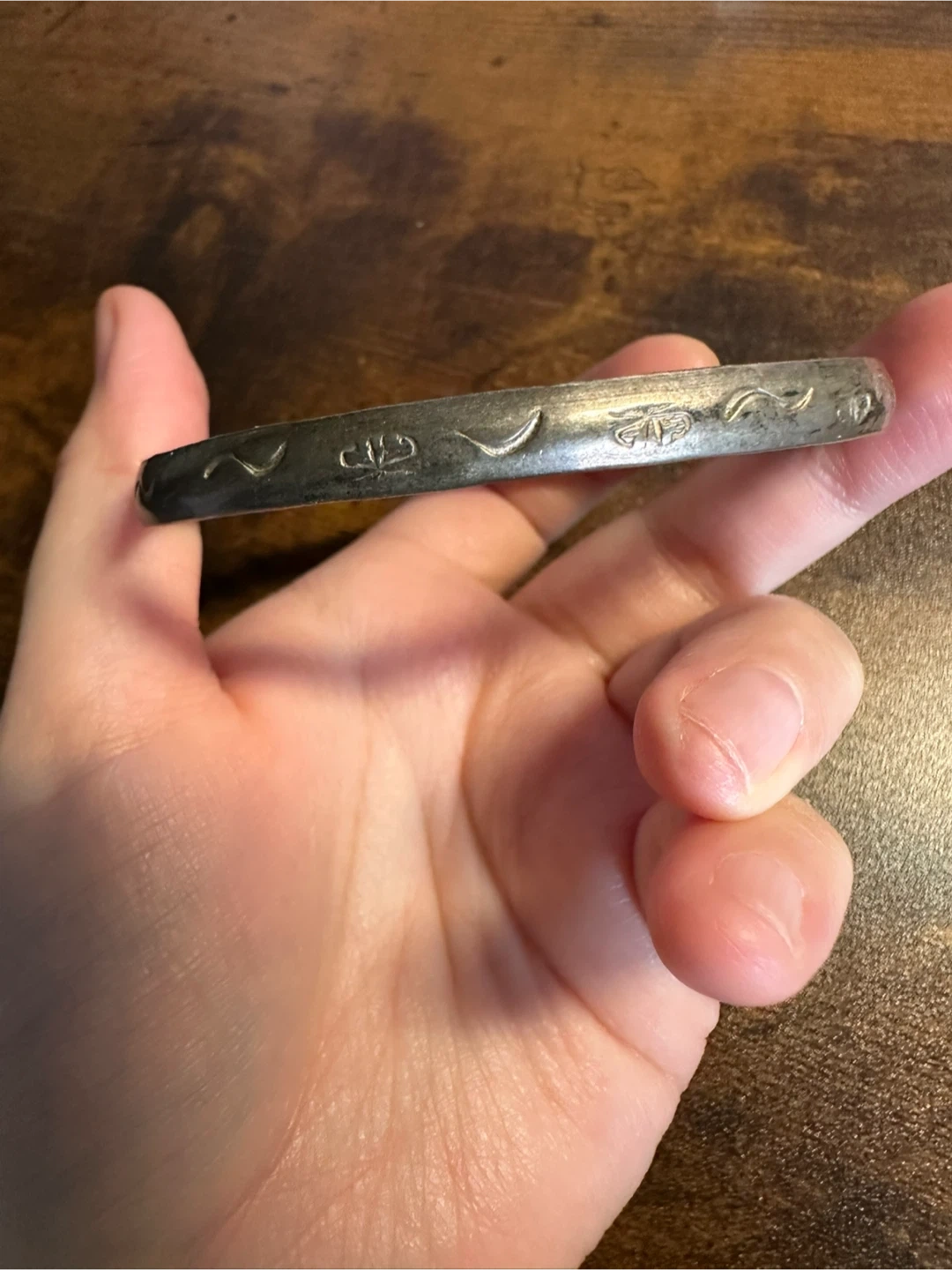 I think this bracelet is silver. The etching is difficult for me to read, but I think it just says “Mexico”. There’s a bit of weight to it given its size.