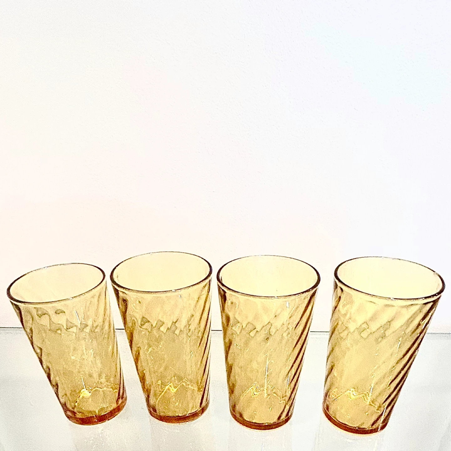 Offered is a matched set of four vintage amber/yellow tumblers with a twist/swirl optic and an applied amber foot/ring base. The glass has that classic mid-century “hand-worked” look—subtle waviness, lively light refraction, and visible swirl movement that collectors chase in barware and studio-style production glass.