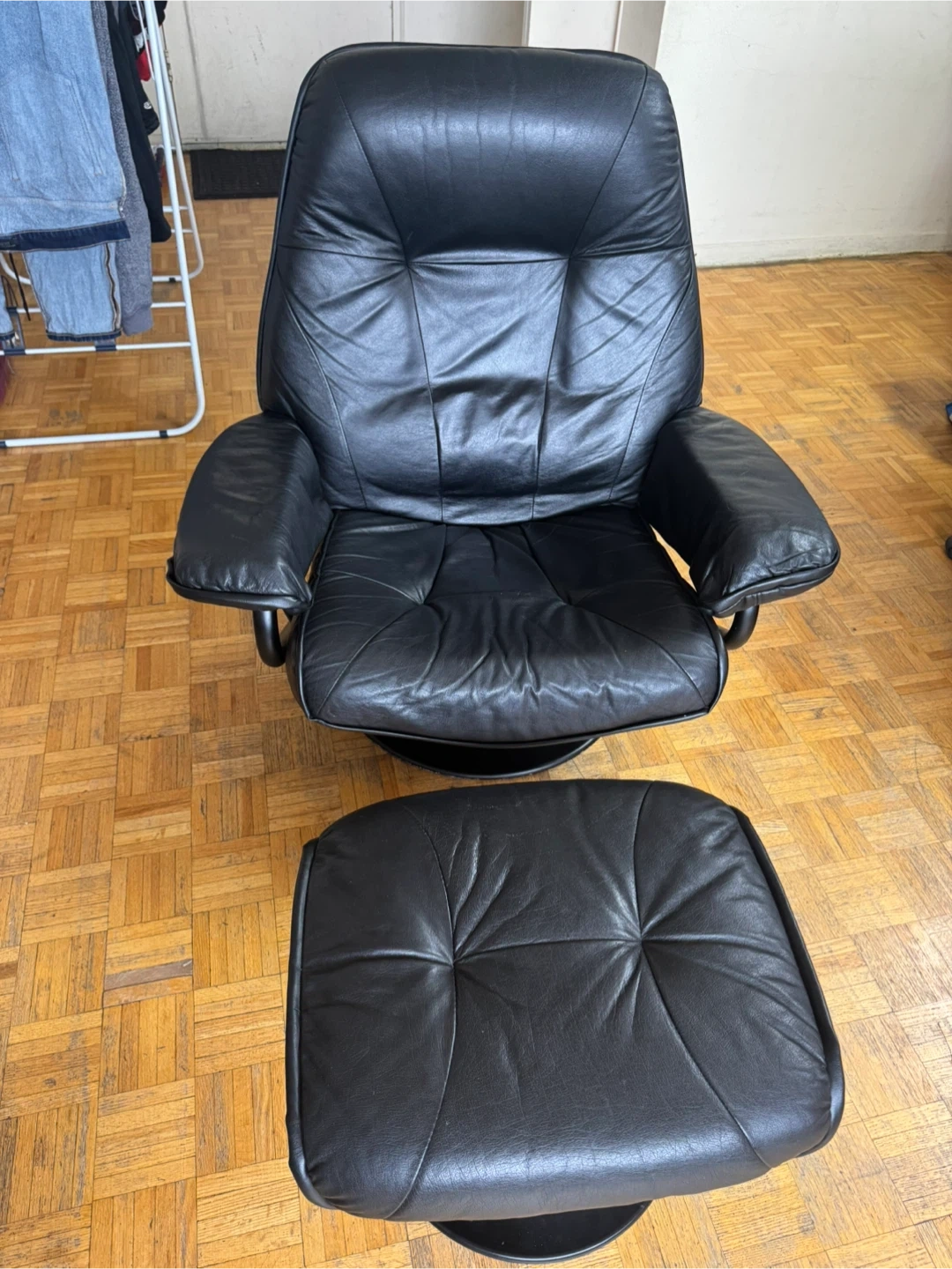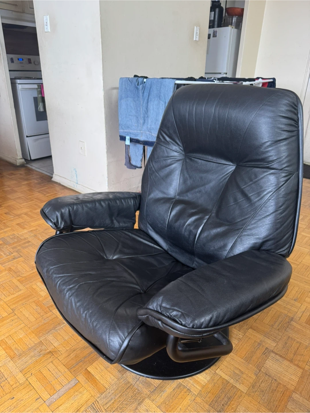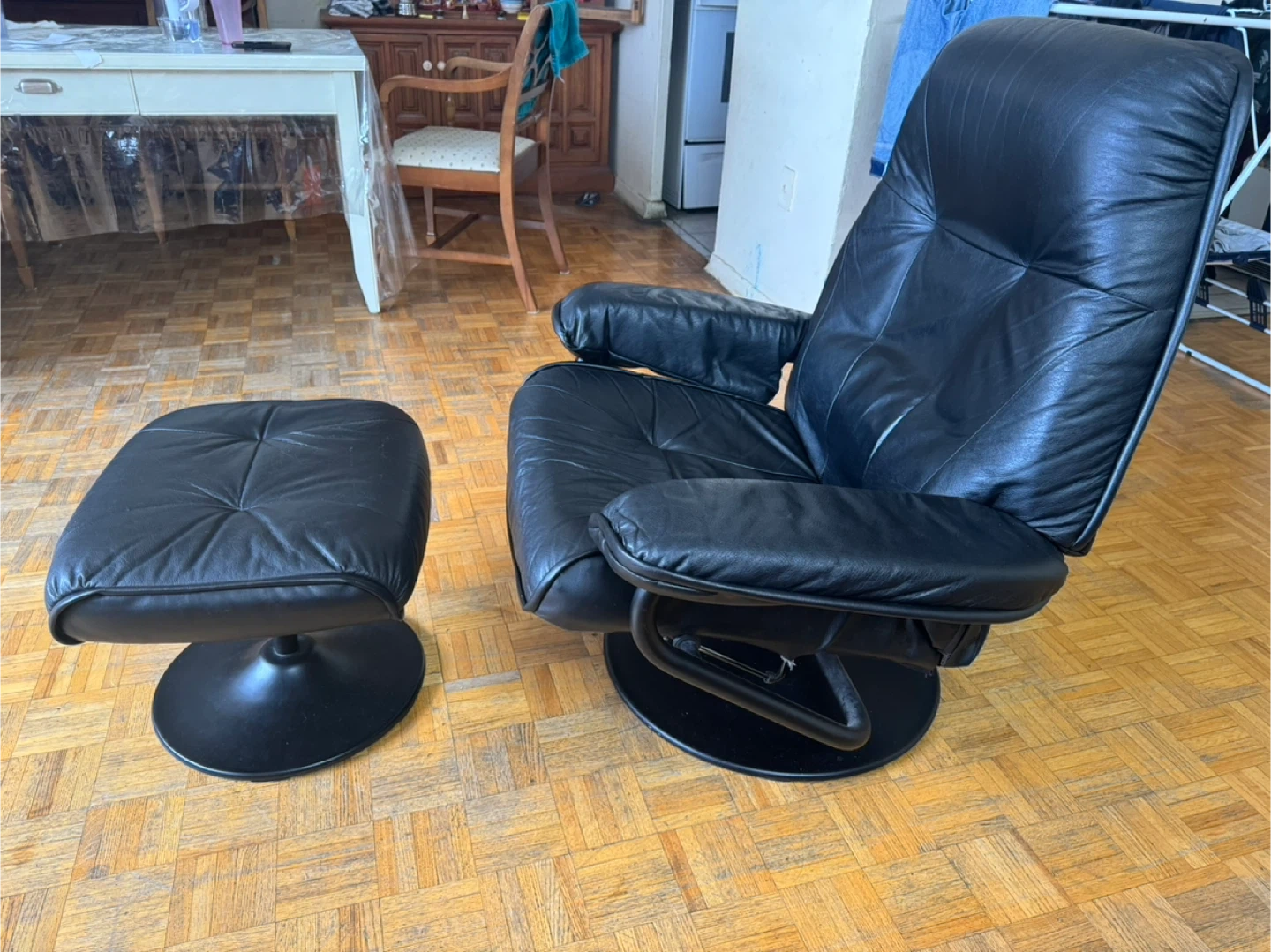 Here's a comfy black leather swivel chair with a matching ottoman. It's in good condition and would be a great addition to any living room or den. The chair swivels smoothly and the ottoman provides extra support for your legs. Perfect for relaxing after a long day!