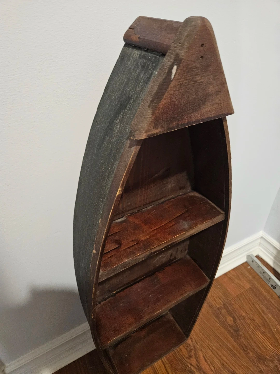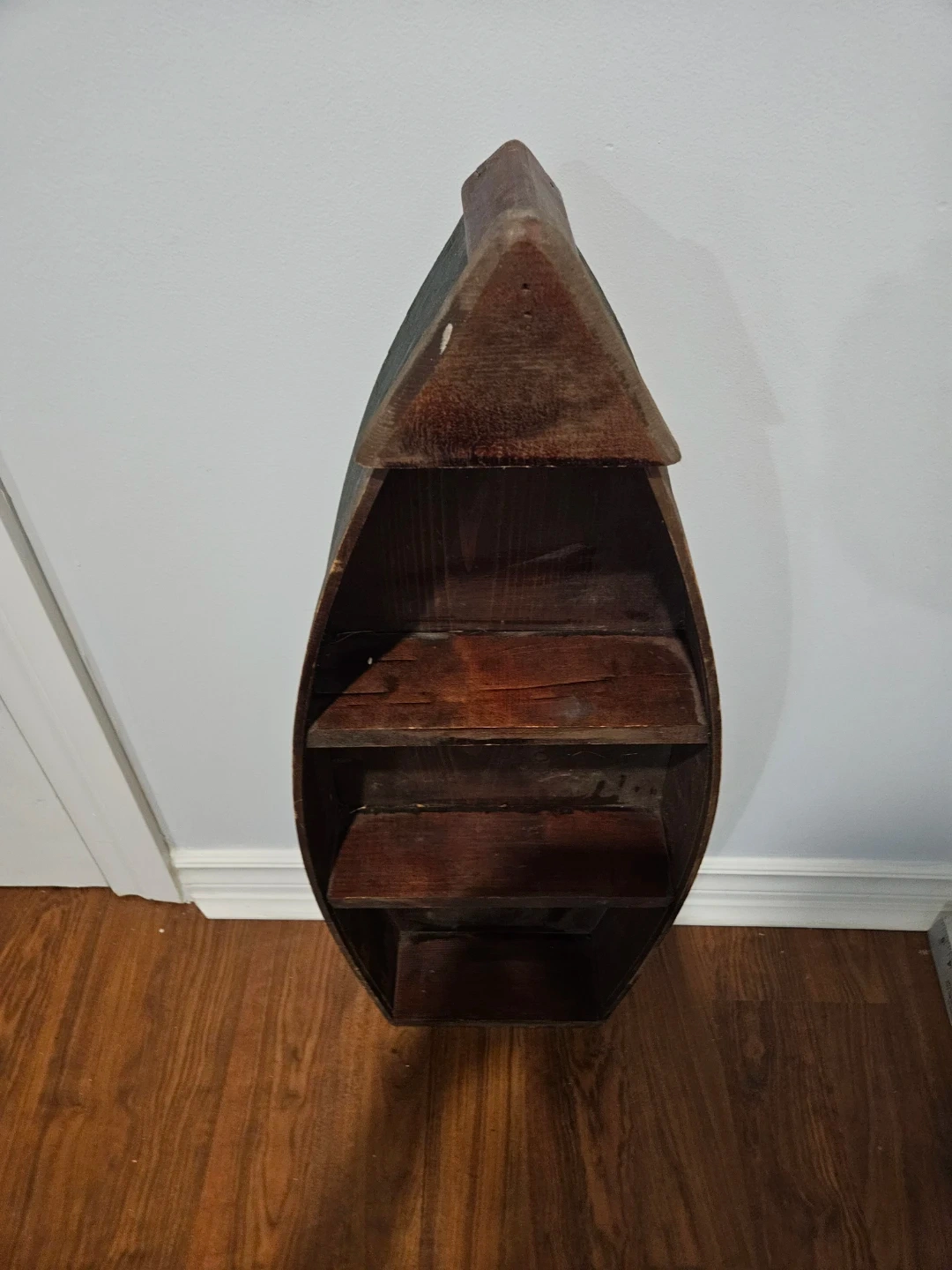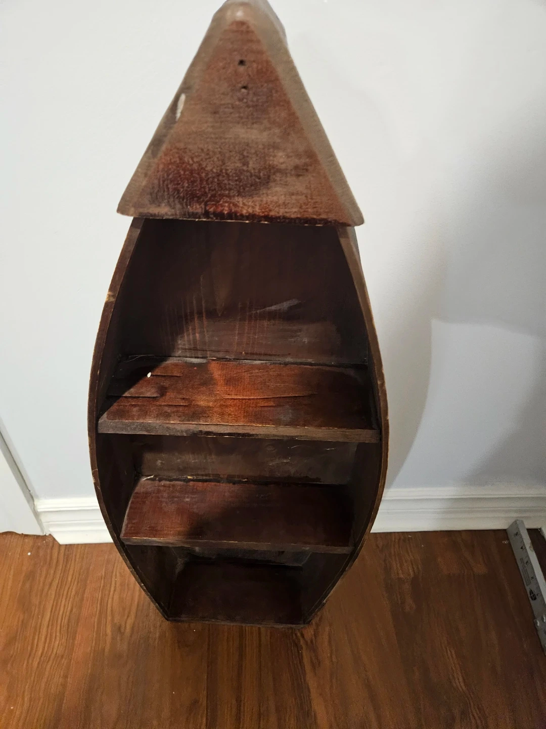 Selling a unique wooden boat-shaped shelf! It has three shelves inside, perfect for displaying small items or books. It's a charming piece that would add character to any room