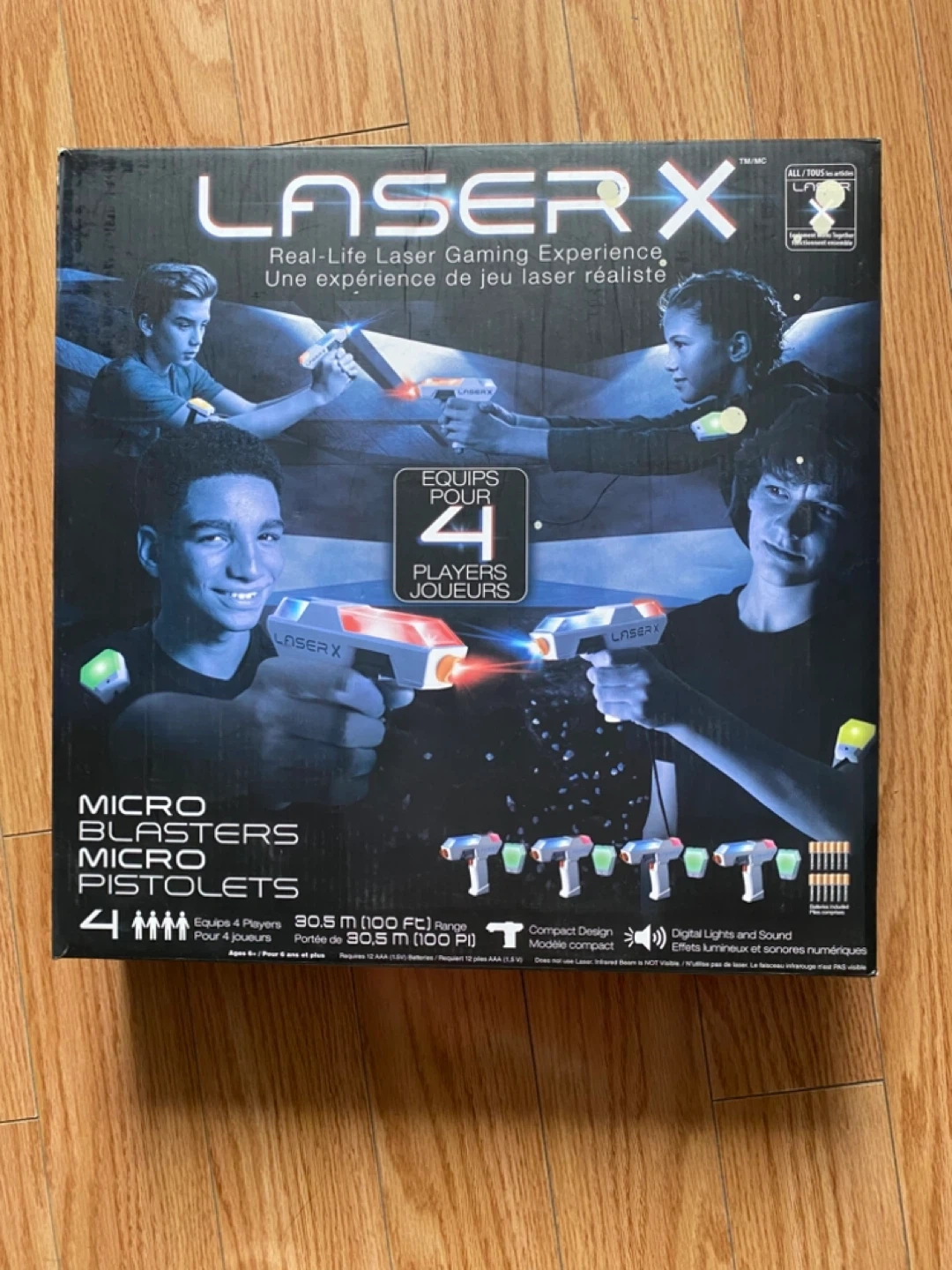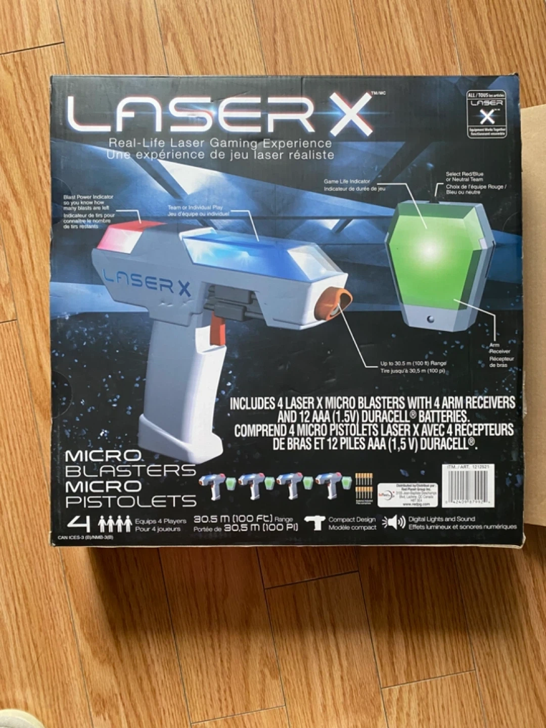 Get ready for some real-life laser gaming fun with this Laser X Micro Blasters set! It's designed for 4 players, so the whole family can join in. The blasters have a range of 30.5 meters (100 ft), and feature compact design and digital lights and sounds. Includes 4 Laser X micro blasters with 4 arm receivers and 12 AAA (1.5V) Duracell batteries. The box is included too!