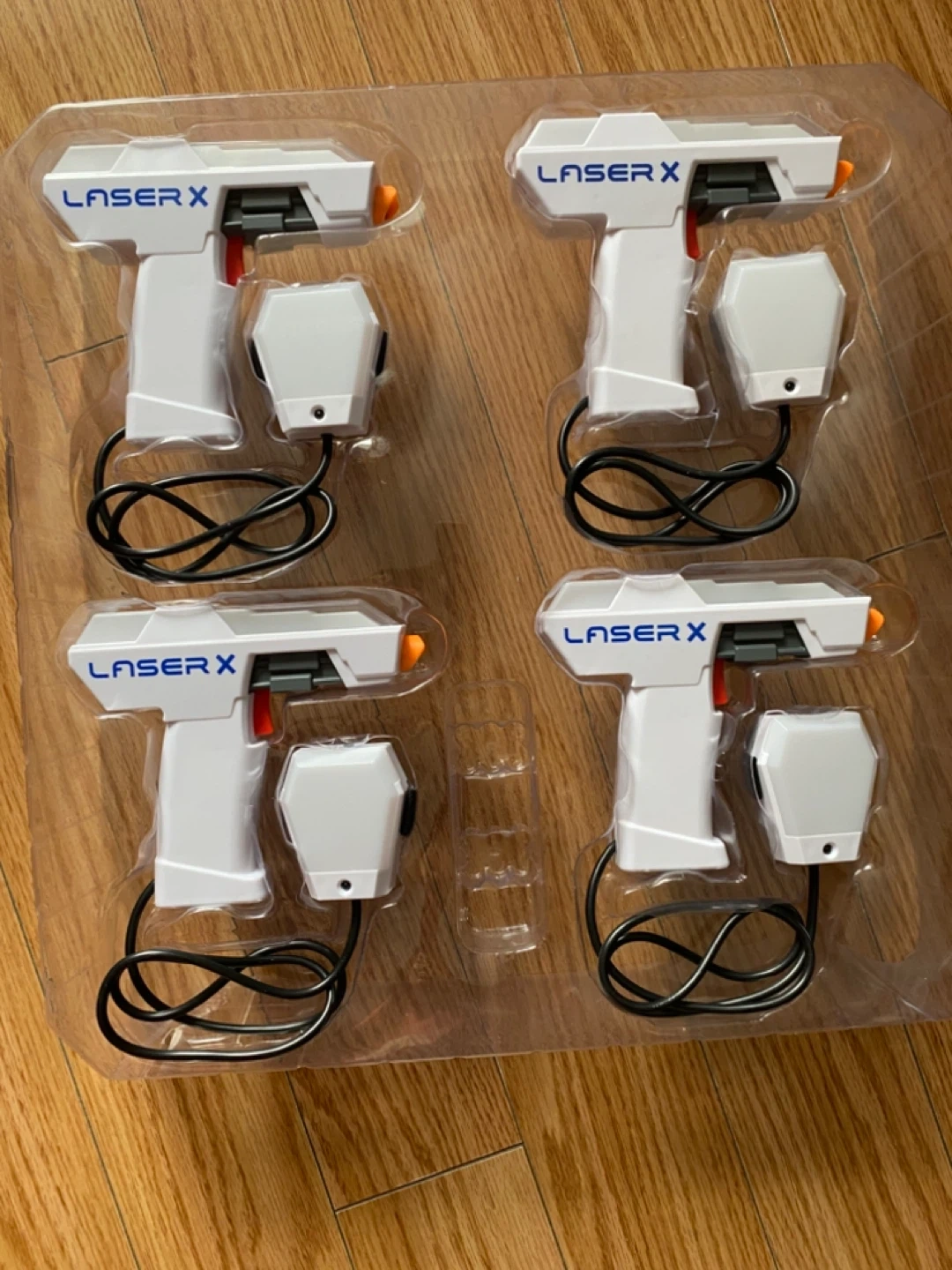Get ready for some real-life laser gaming fun with this Laser X Micro Blasters set! It's designed for 4 players, so the whole family can join in. The blasters have a range of 30.5 meters (100 ft), and feature compact design and digital lights and sounds. Includes 4 Laser X micro blasters with 4 arm receivers and 12 AAA (1.5V) Duracell batteries. The box is included too!