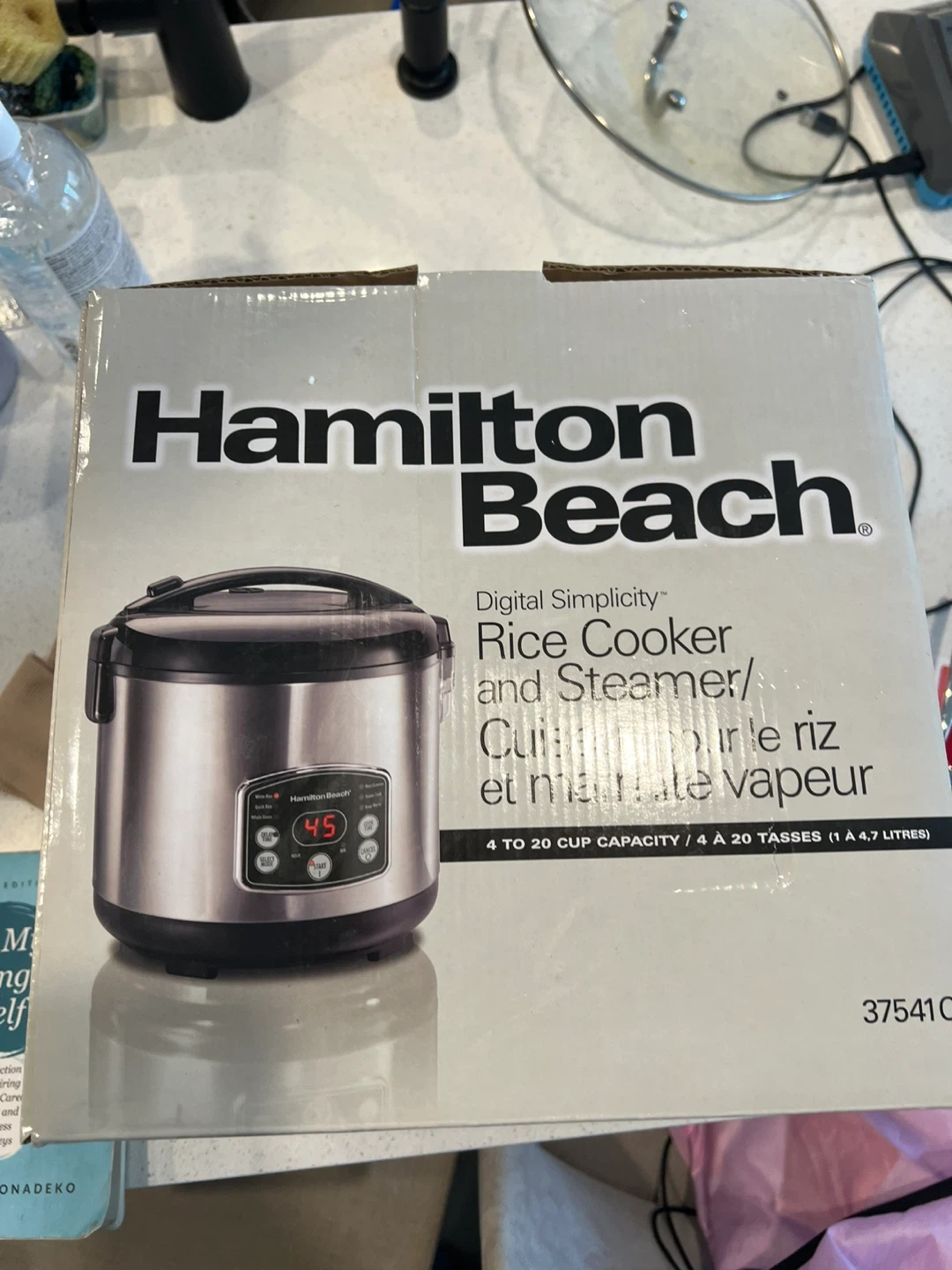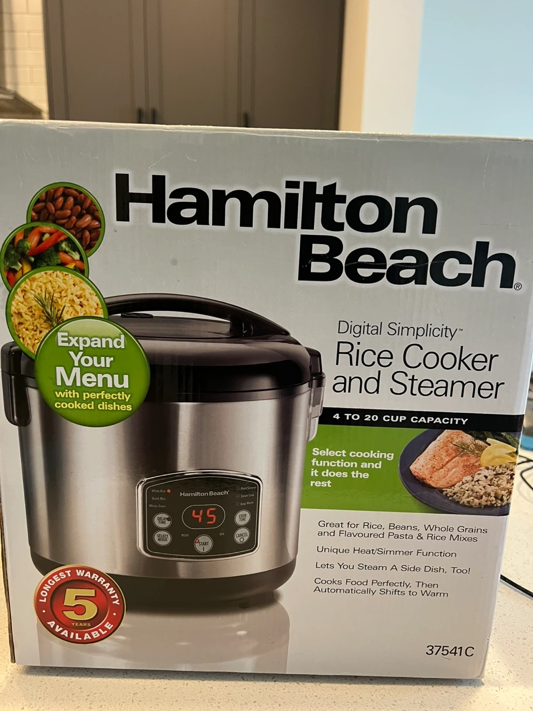Selling a Hamilton Beach Digital Simplicity Rice Cooker and Steamer. It has a 4 to 20 cup capacity (4.7 litres). Great for rice, beans, whole grains and flavoured pasta and rice mixes. It lets you steam a side dish too! Cooks food perfectly and then automatically shifts to warm