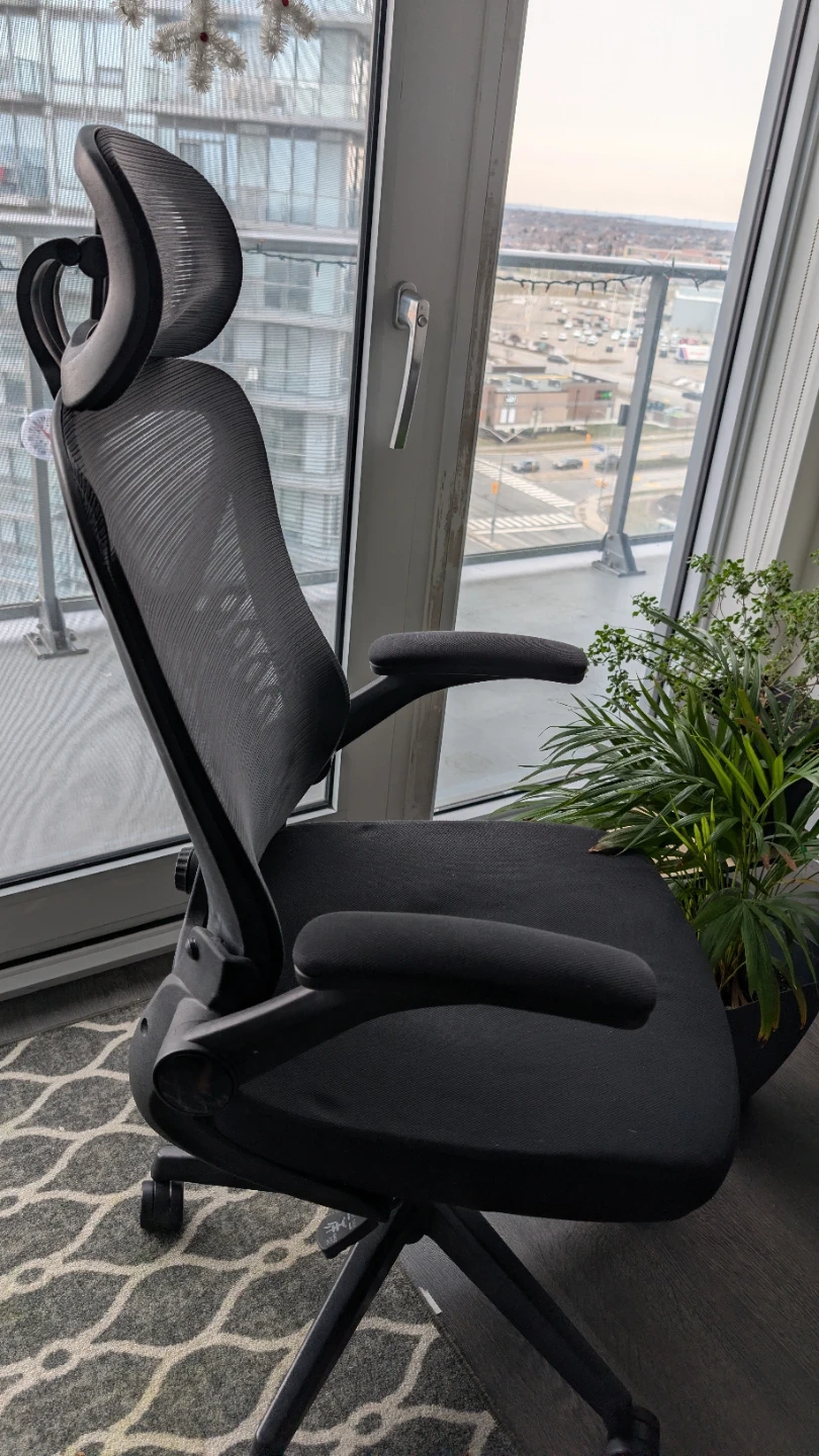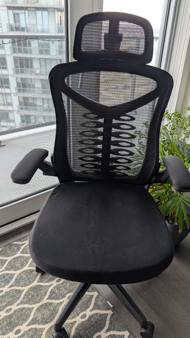 Selling a comfortable ergonomic office chair in black. It's in great condition and perfect for working from home or the office. The chair features a headrest and adjustable armrests for optimal support during long hours of work