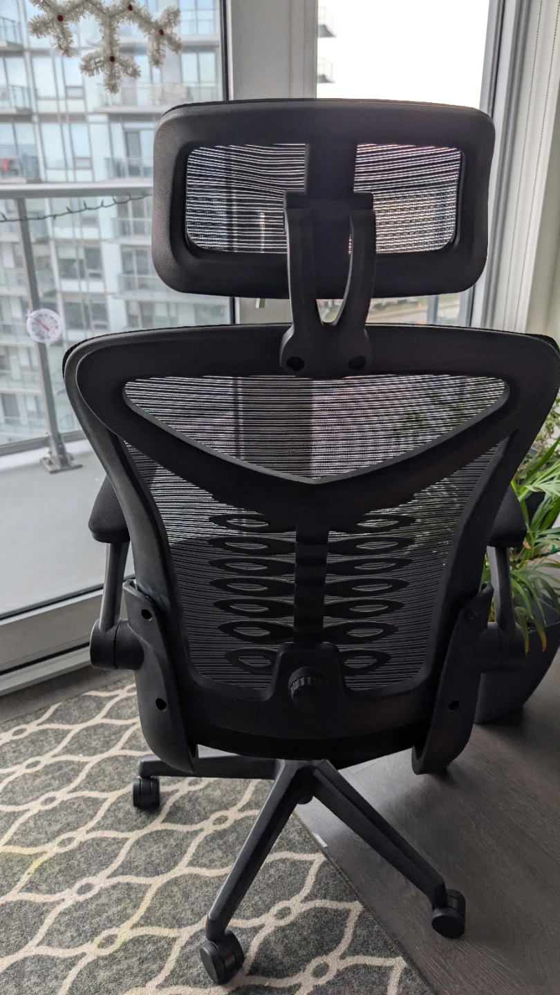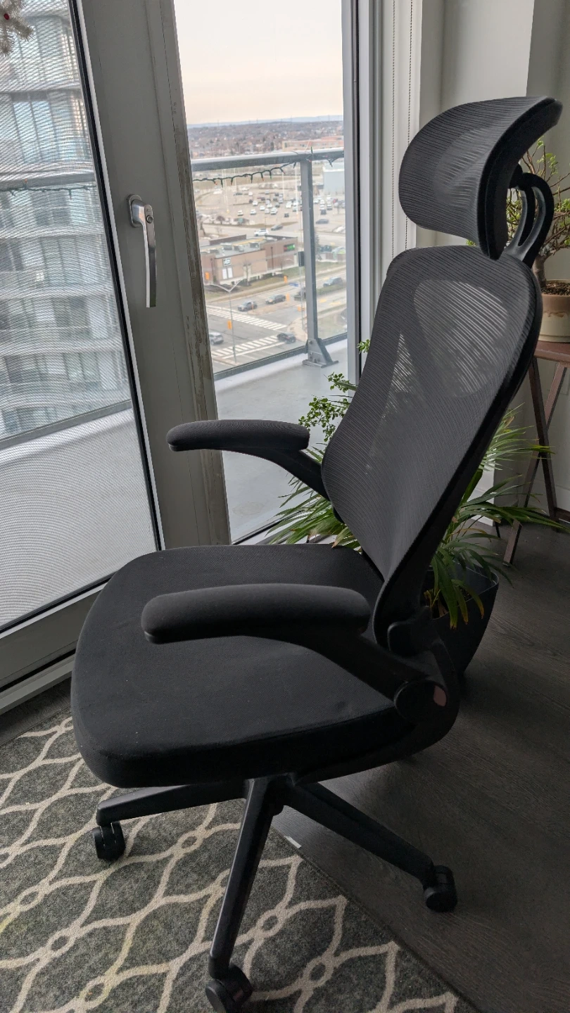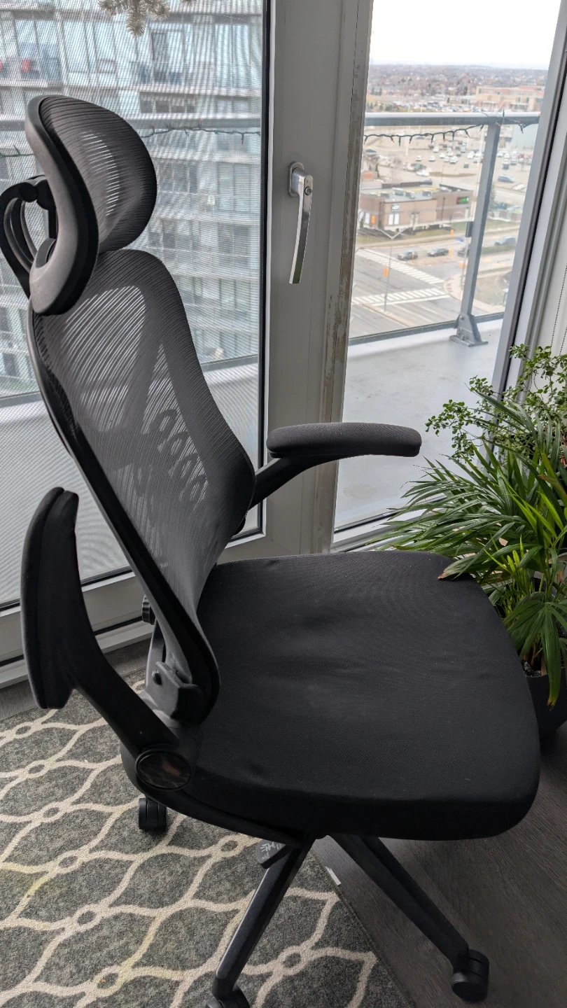 Selling a comfortable ergonomic office chair in black. It's in great condition and perfect for working from home or the office. The chair features a headrest and adjustable armrests for optimal support during long hours of work