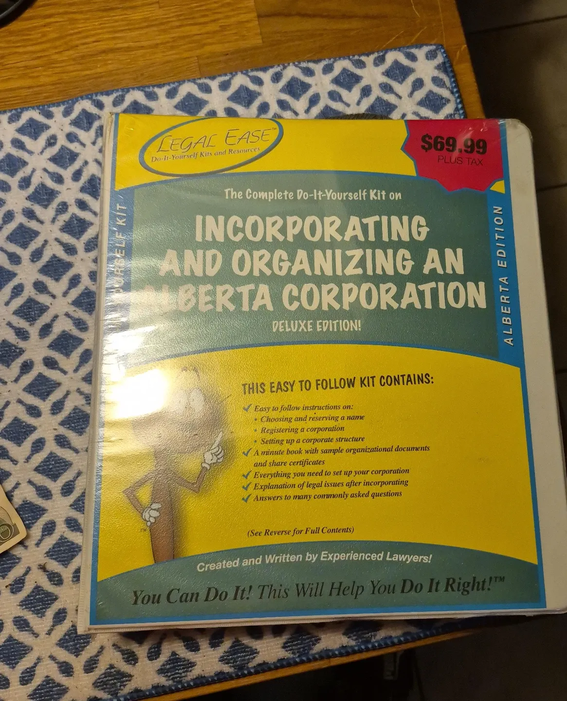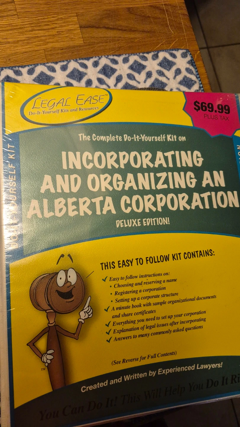 Selling a Legal Ease kit for incorporating and organizing an Alberta corporation. This is the deluxe edition and is still sealed in its original packaging. The kit includes easy-to-follow instructions on choosing a name, registering a corporation, setting up a corporate structure, and more. Originally priced at $69.99 plus tax, this kit is created and written by experienced lawyers to help you do it right!