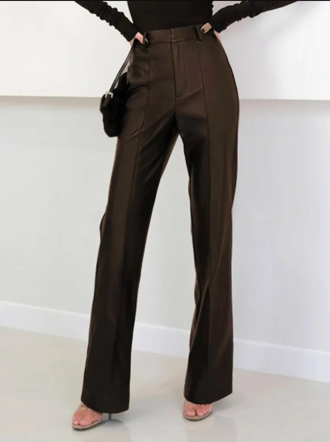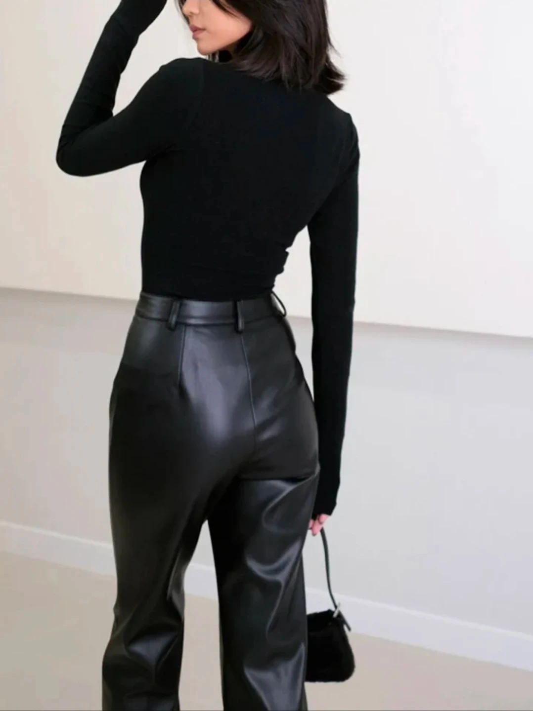 Selling a pair of faux leather wide leg pants in black. These pants are a stylish and comfortable addition to any wardrobe! The wide leg design offers a flattering silhouette, and the faux leather material gives them a modern edge