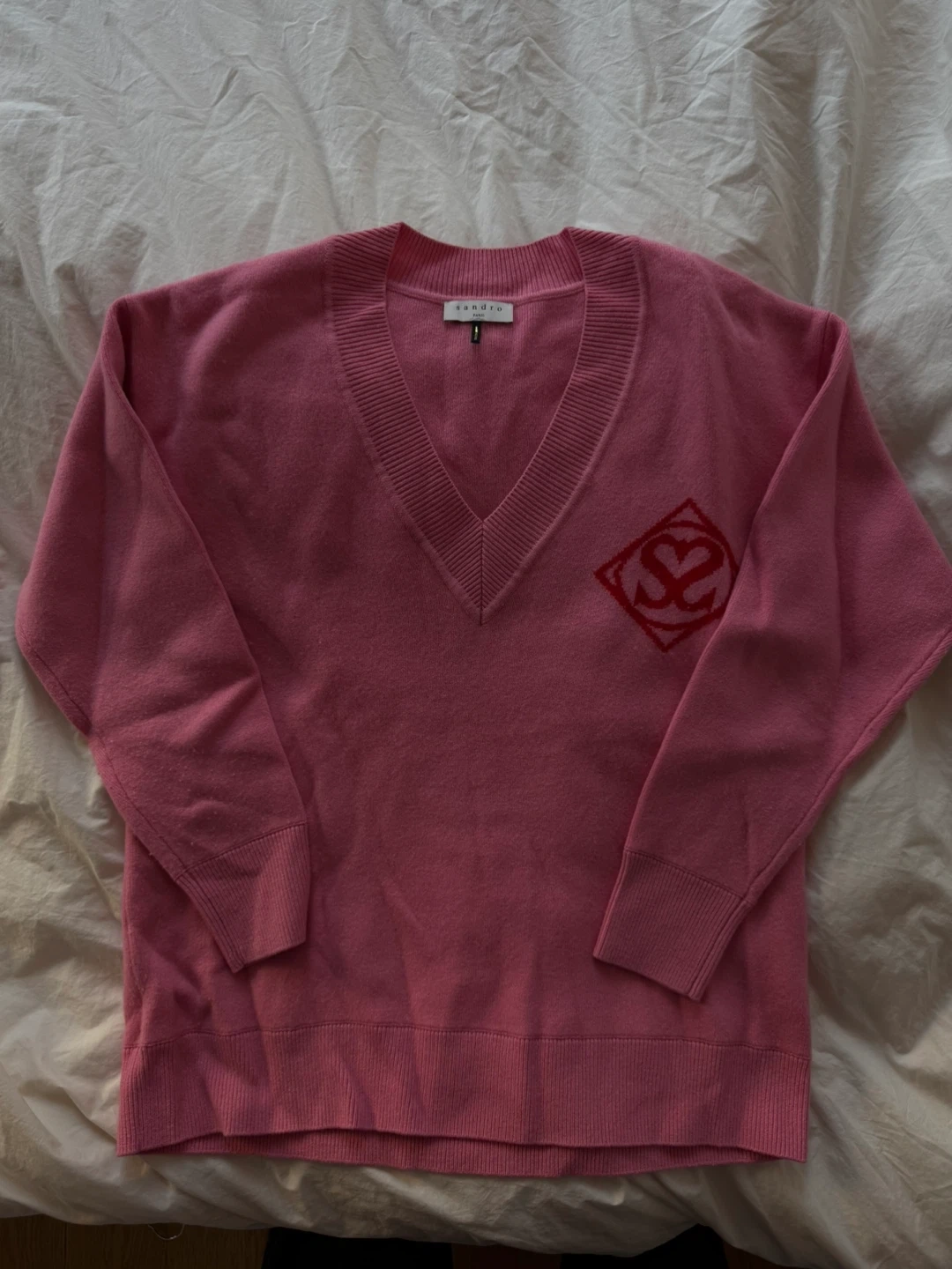 Selling a Sandro Paris V-neck sweater in a lovely pink color! It's a size small-mediumand features a unique design on the front. Perfect for adding a pop of color to your wardrobe!