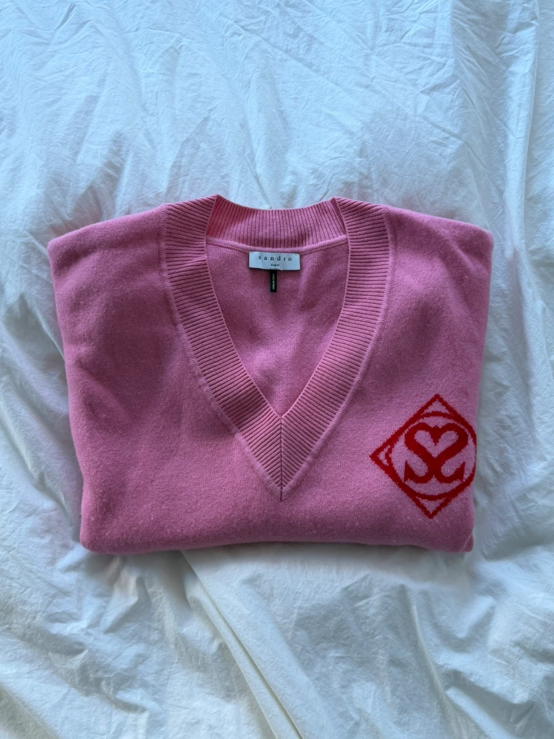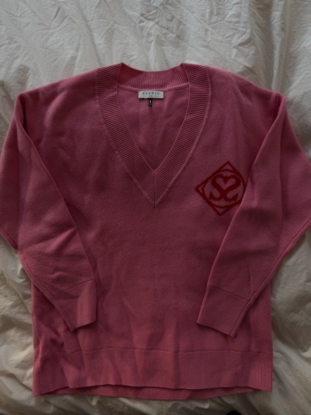 Selling a Sandro Paris V-neck sweater in a lovely pink color! It's a size small-mediumand features a unique design on the front. Perfect for adding a pop of color to your wardrobe!