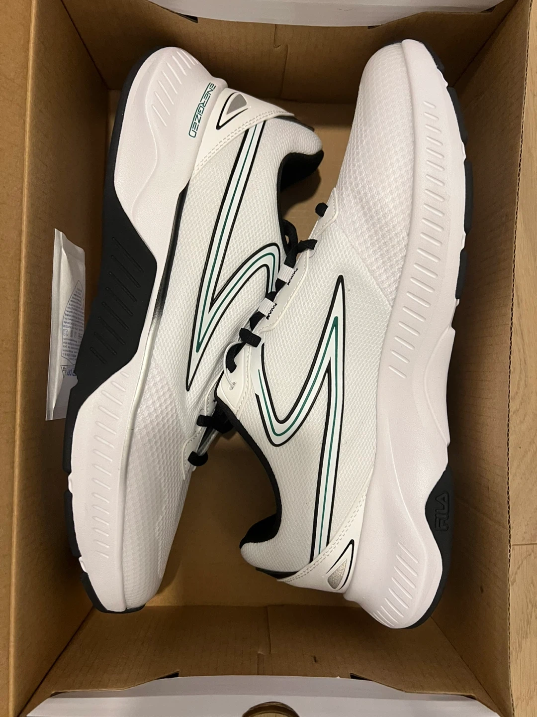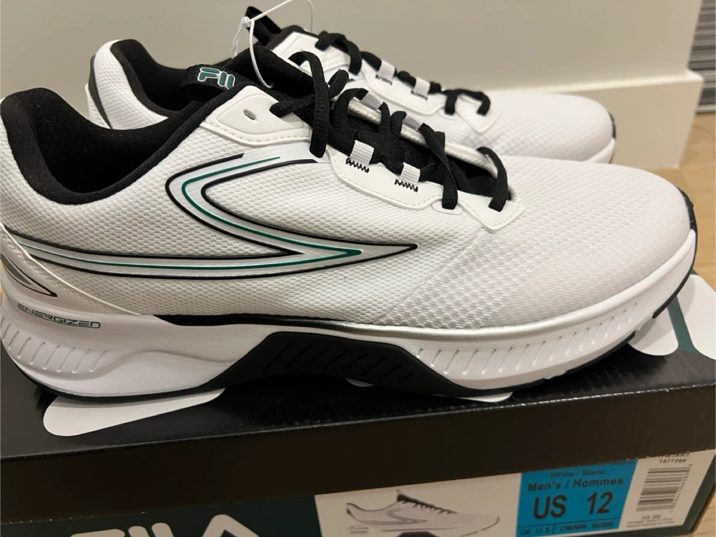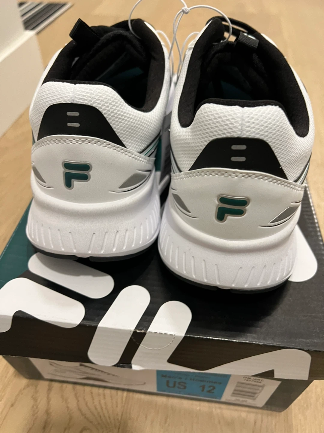 I'm selling a brand new pair of Fila Men's shoes in size 12! They are white with black accents and a green stripe. Comes with the original box
