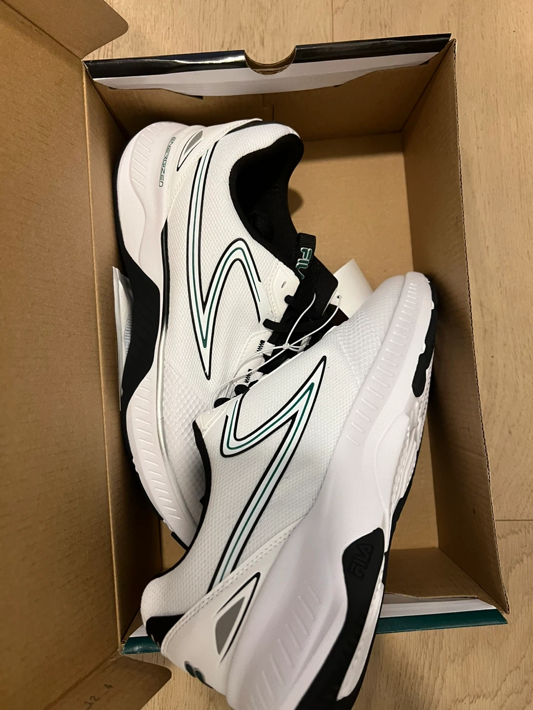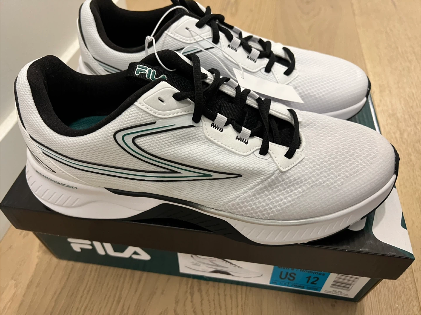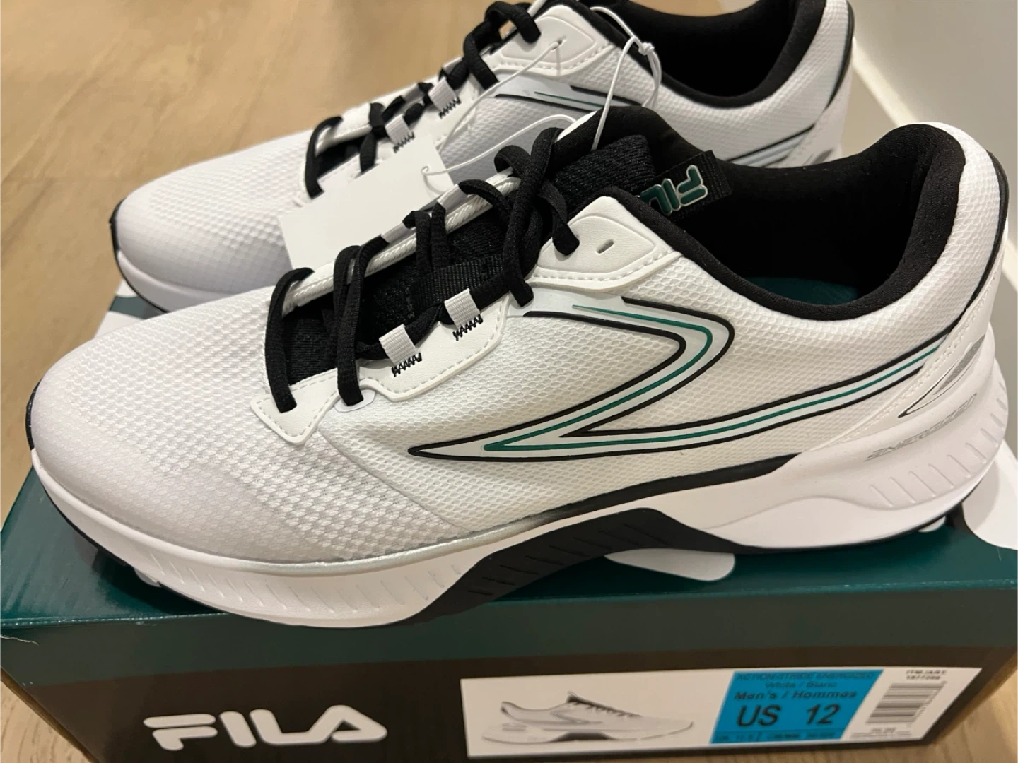 I'm selling a brand new pair of Fila Men's shoes in size 12! They are white with black accents and a green stripe. Comes with the original box