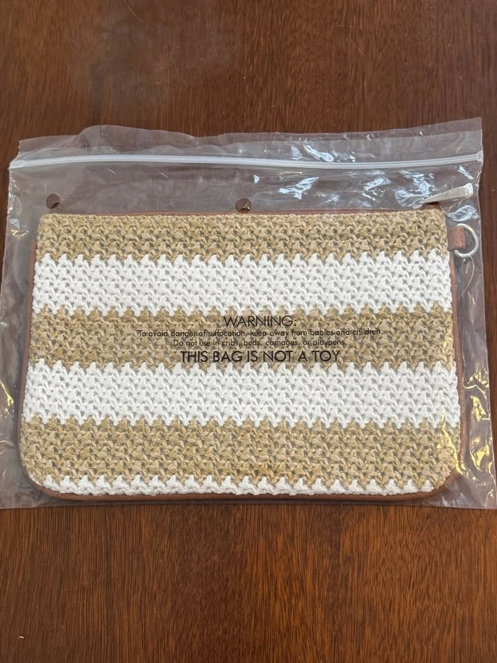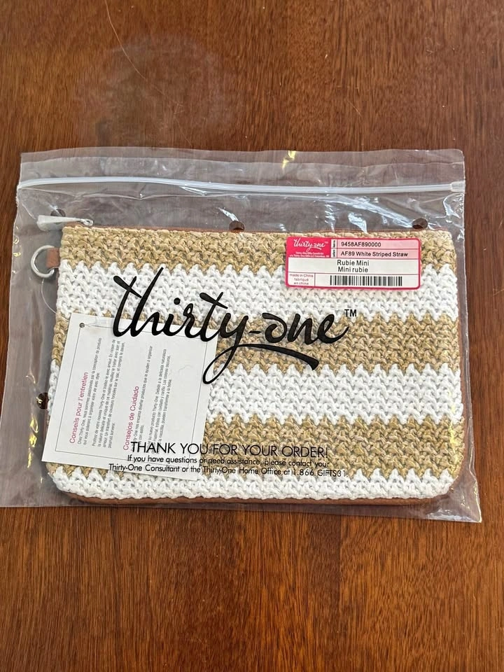 The Rubie Mini by Thirty-one. Pattern is called White Striped Straw. $20