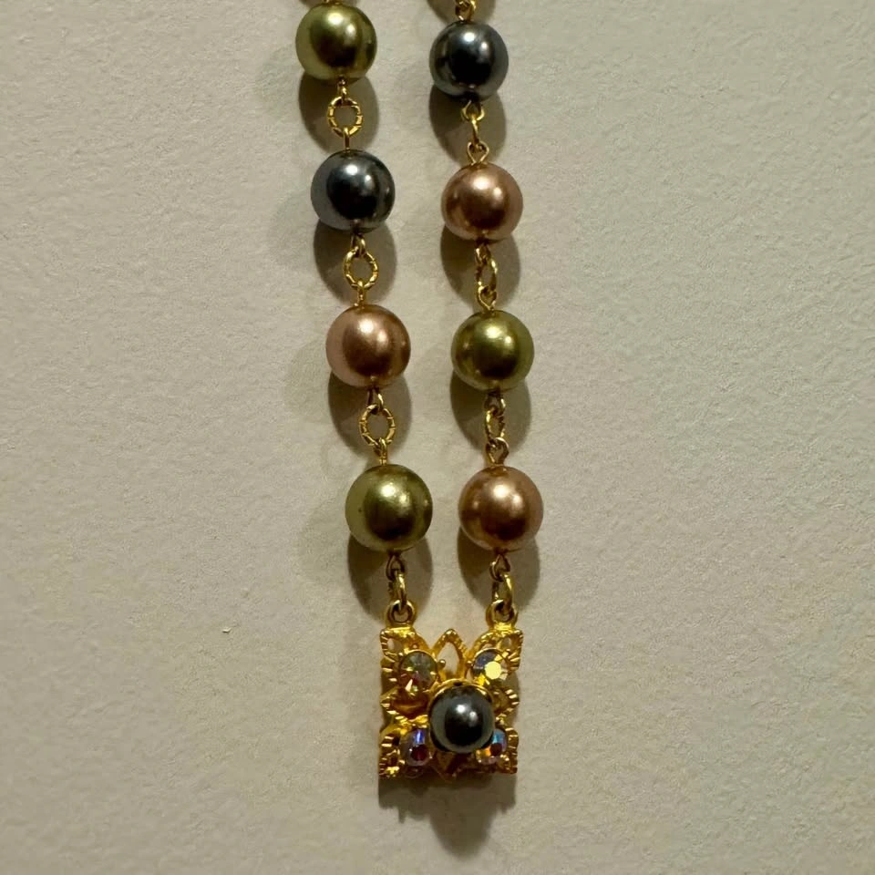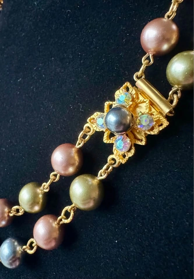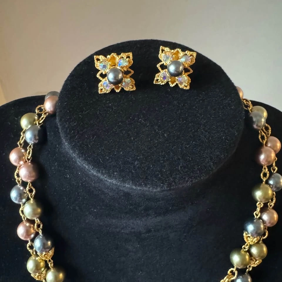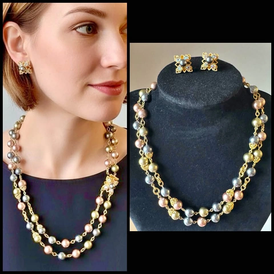 Signed Vintage Joan Rivers double strand coloured faux pearls (beautiful pastel shades of pink, grey, blue, gray, olive green) and prong set aurora borealis rhinestones. Set of necklace with matching clip on earrings. The necklace and earrings are in gold tone metal and are each signed “Joan Rivers”. Beautiful collectible!