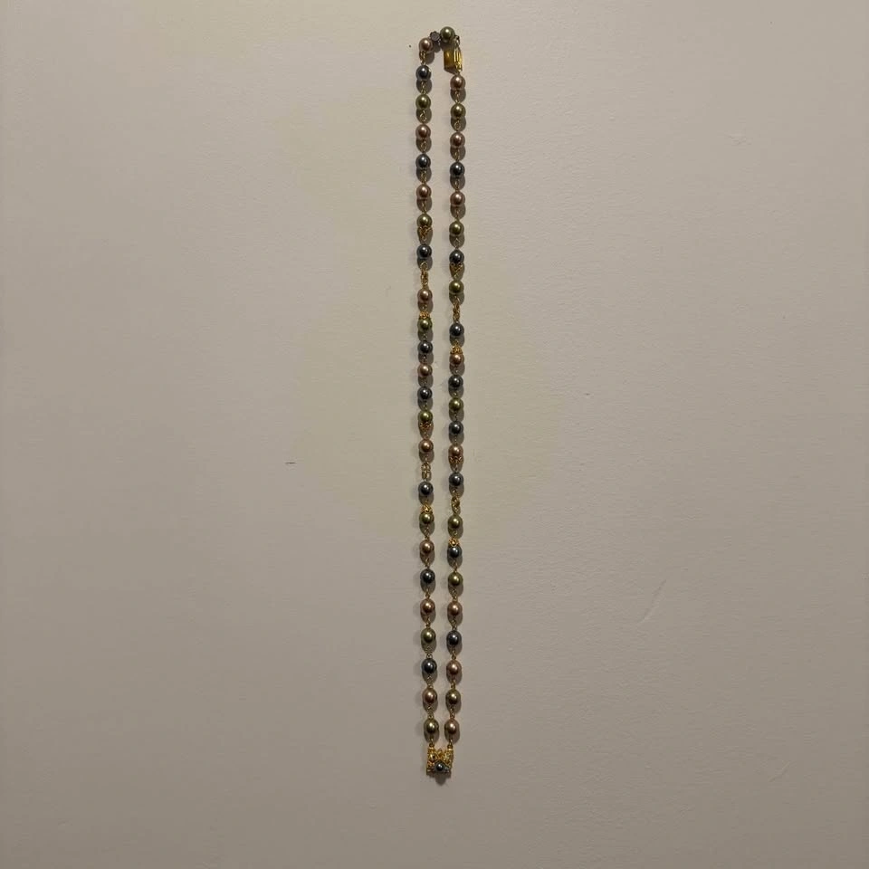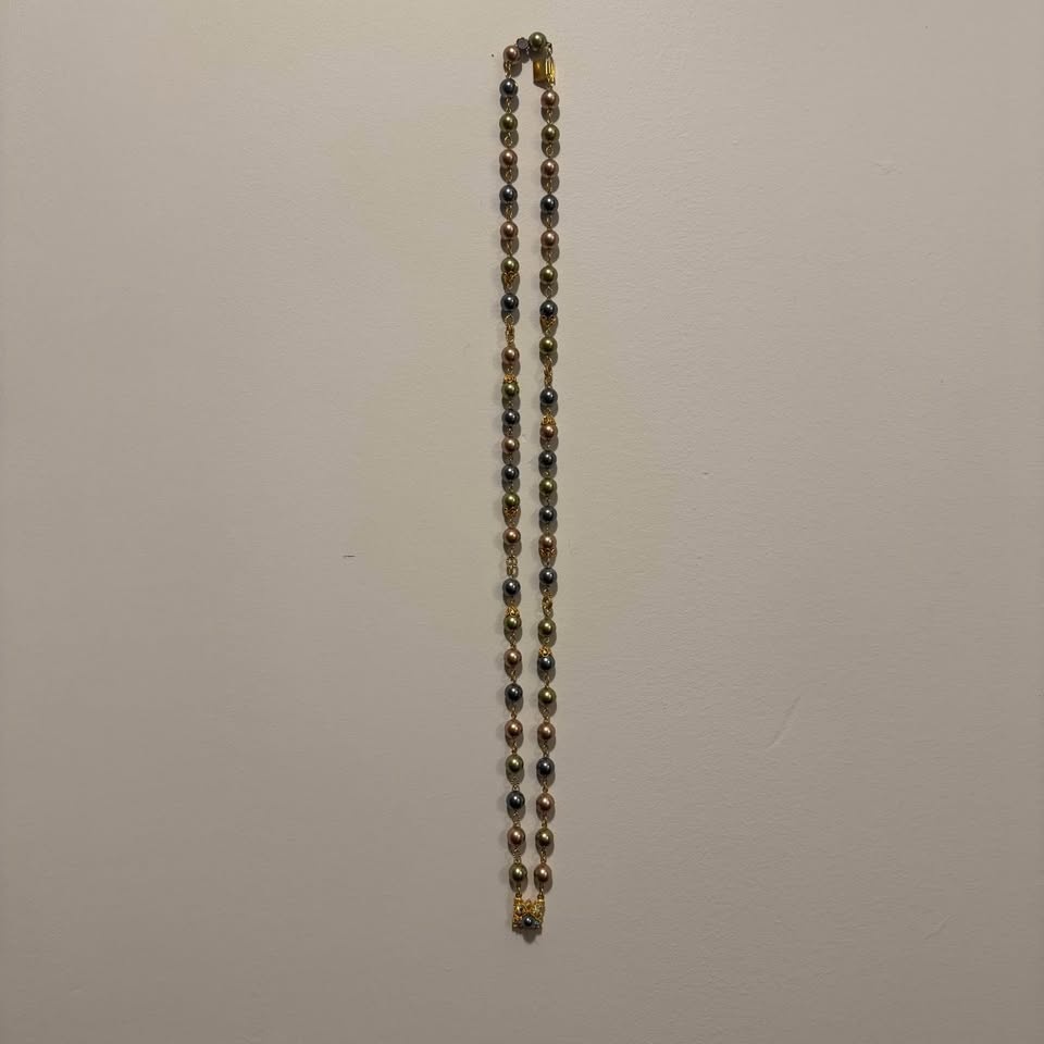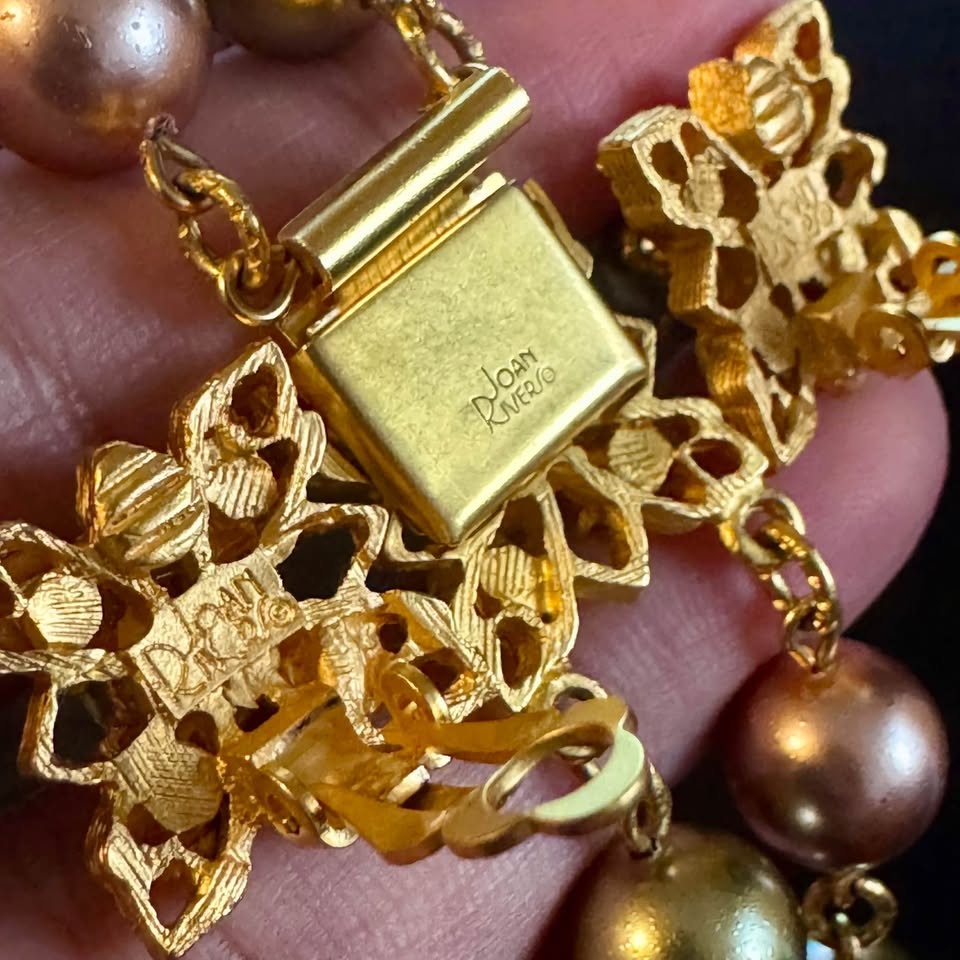 Signed Vintage Joan Rivers double strand coloured faux pearls (beautiful pastel shades of pink, grey, blue, gray, olive green) and prong set aurora borealis rhinestones. Set of necklace with matching clip on earrings. The necklace and earrings are in gold tone metal and are each signed “Joan Rivers”. Beautiful collectible!