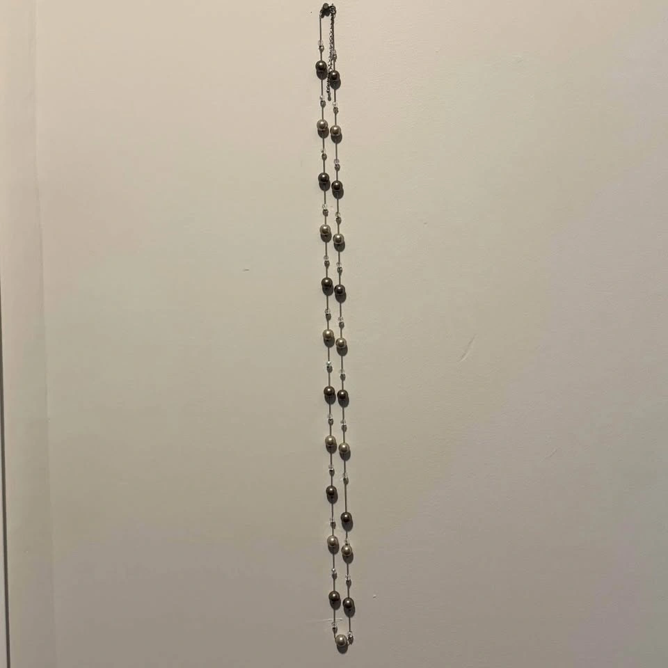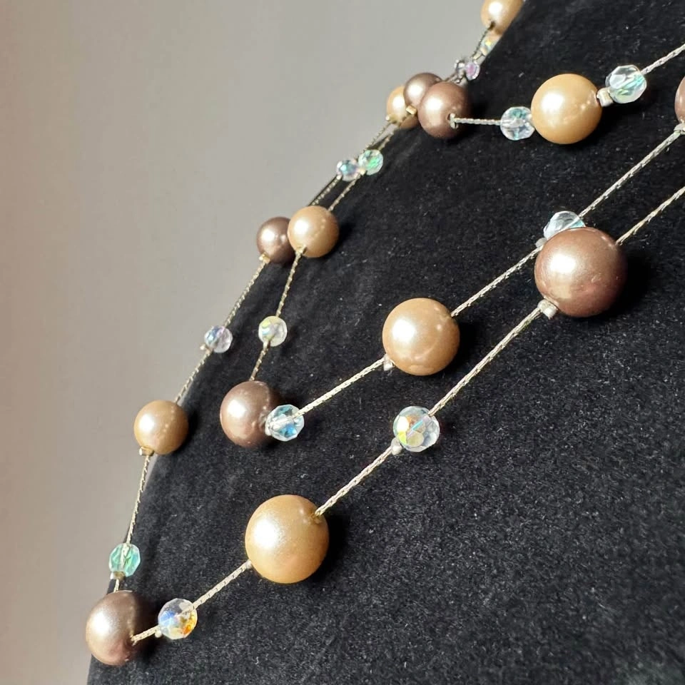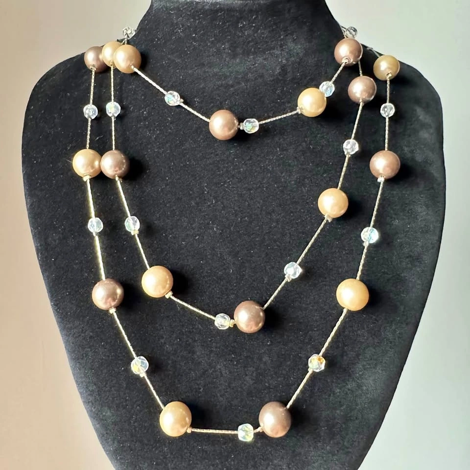 This exquisite Lia Sophia necklace showcases a sophisticated blend of gold, beige and brown hues. Long station necklace with clasp that can be worn long or doubled or tripled around the neck. Looks beautiful when worn layered. Lovely neutral tones that will elevate any outfit without overwhelming your ensemble—simple yet classy! The necklace is adorned with spherical glass pearls and contrasting smaller faceted iridescent spacer beads, creating a harmonious and elegant design.