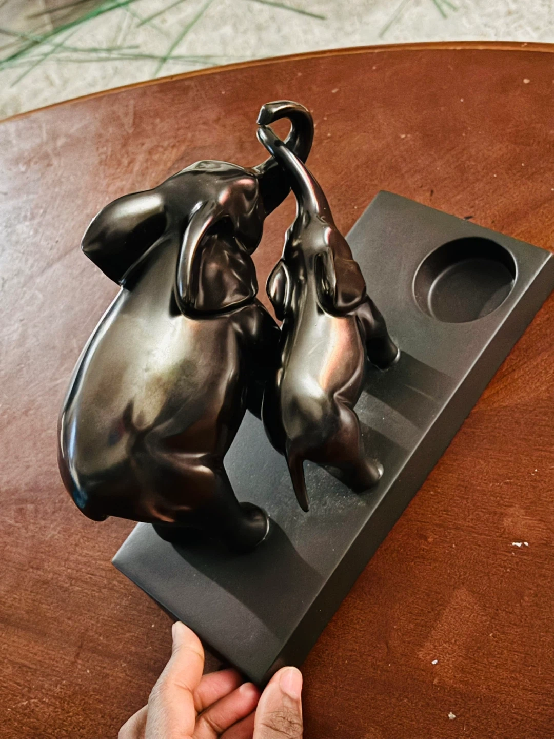 Beautiful elephant sculpture featuring a mother and baby in a bronze finish. It's in great condition and comes with the original box! Perfect for adding a touch of elegance to your home decor