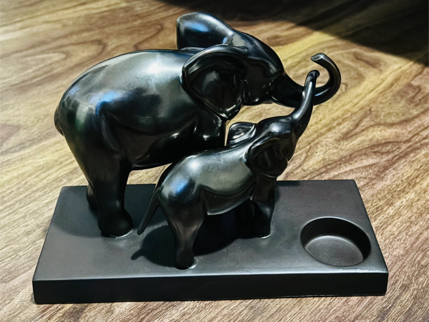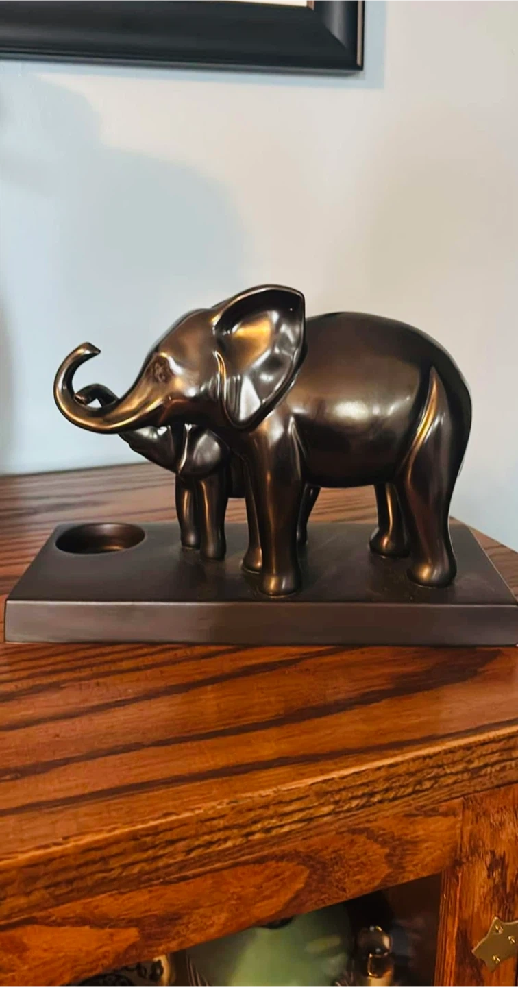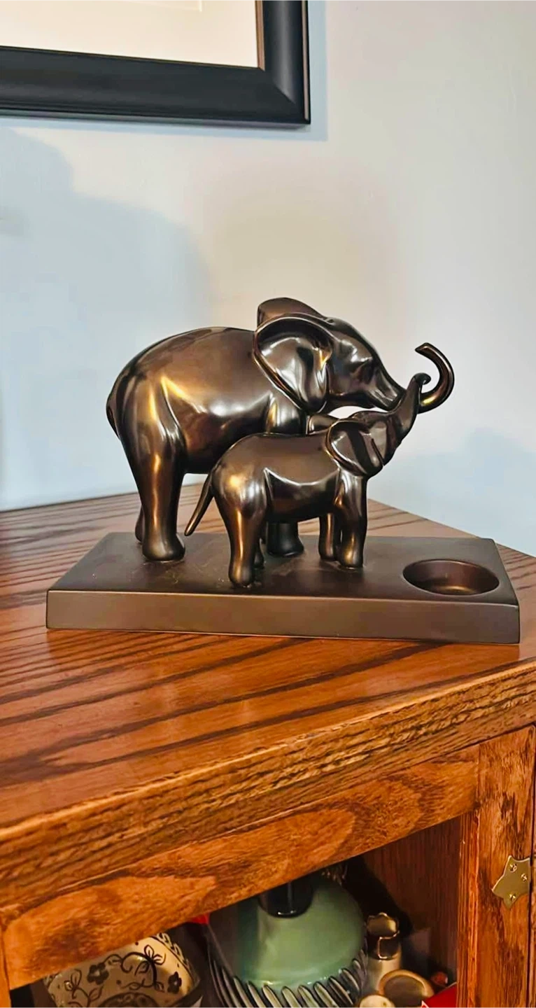 Beautiful elephant sculpture featuring a mother and baby in a bronze finish. It's in great condition and comes with the original box! Perfect for adding a touch of elegance to your home decor