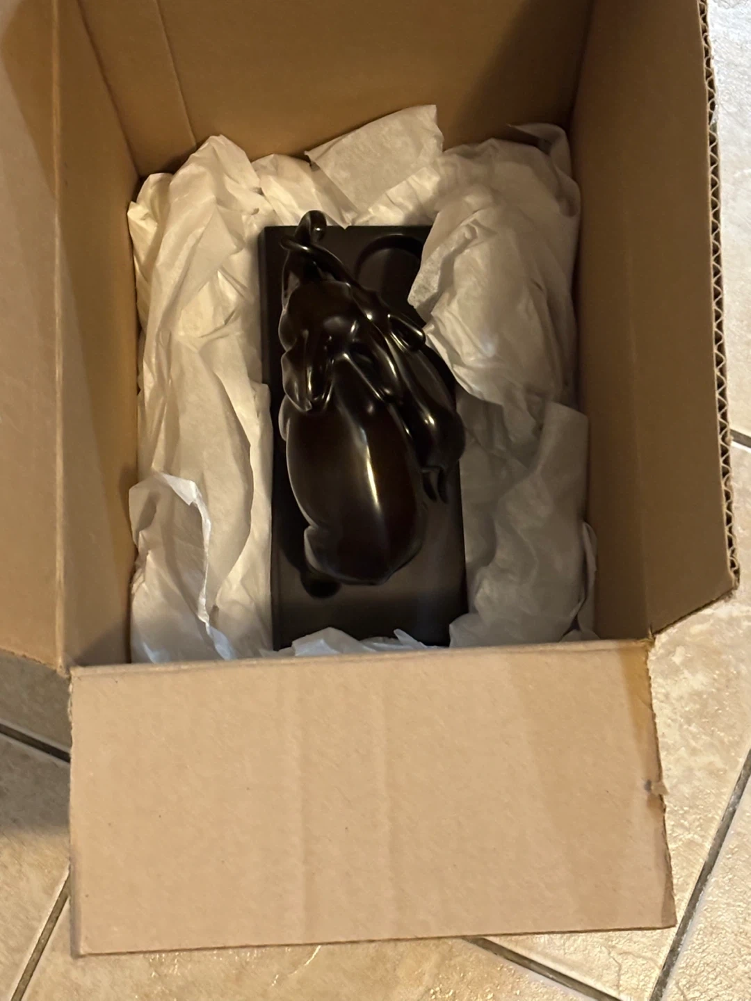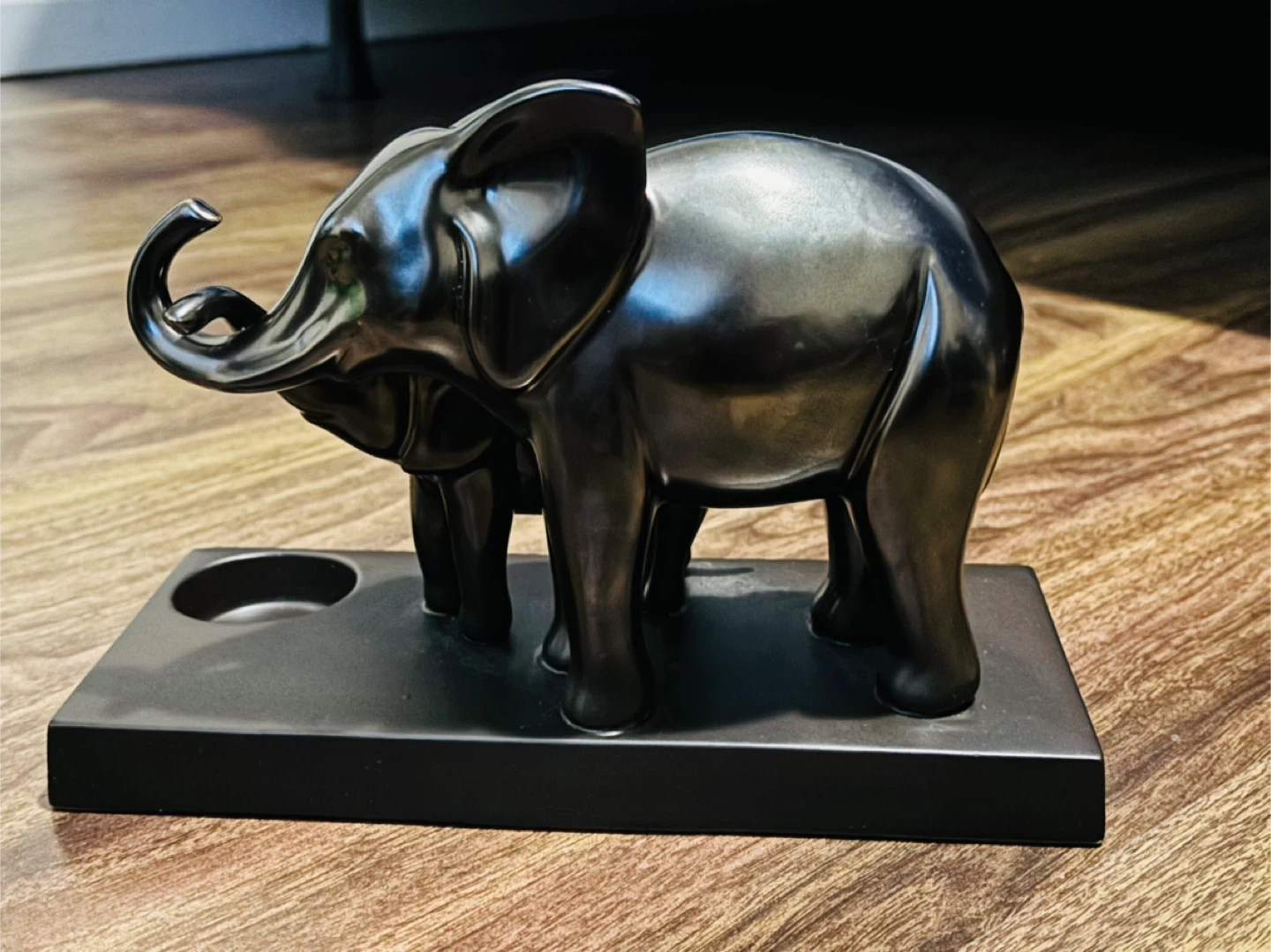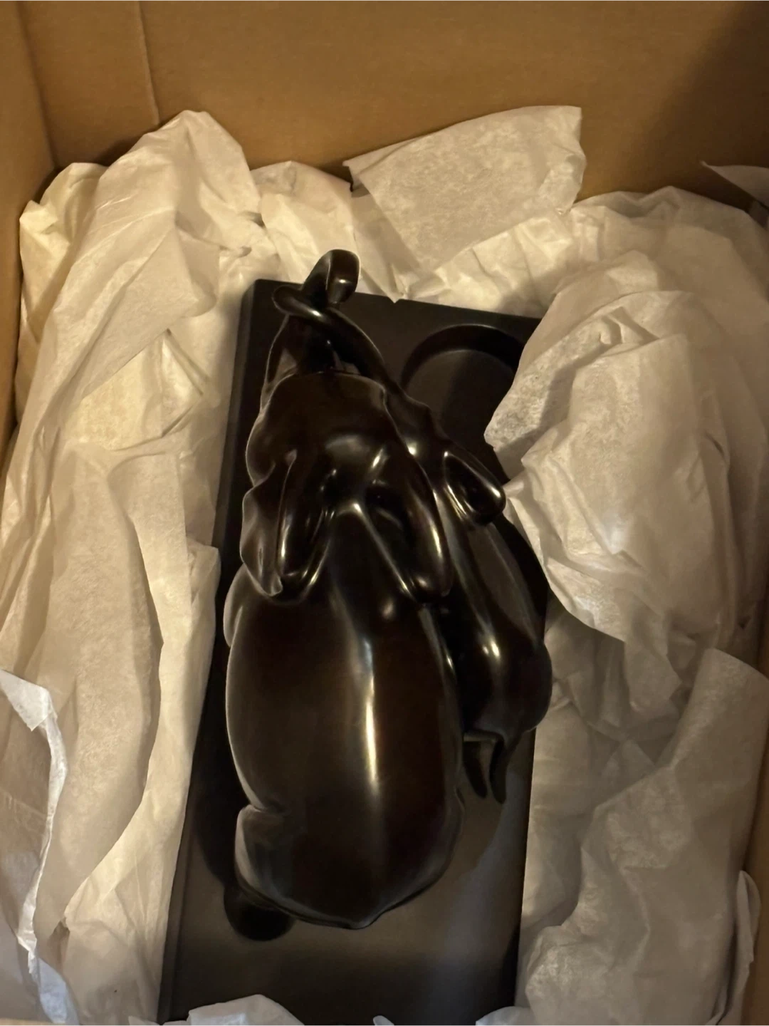 Beautiful elephant sculpture featuring a mother and baby in a bronze finish. It's in great condition and comes with the original box! Perfect for adding a touch of elegance to your home decor