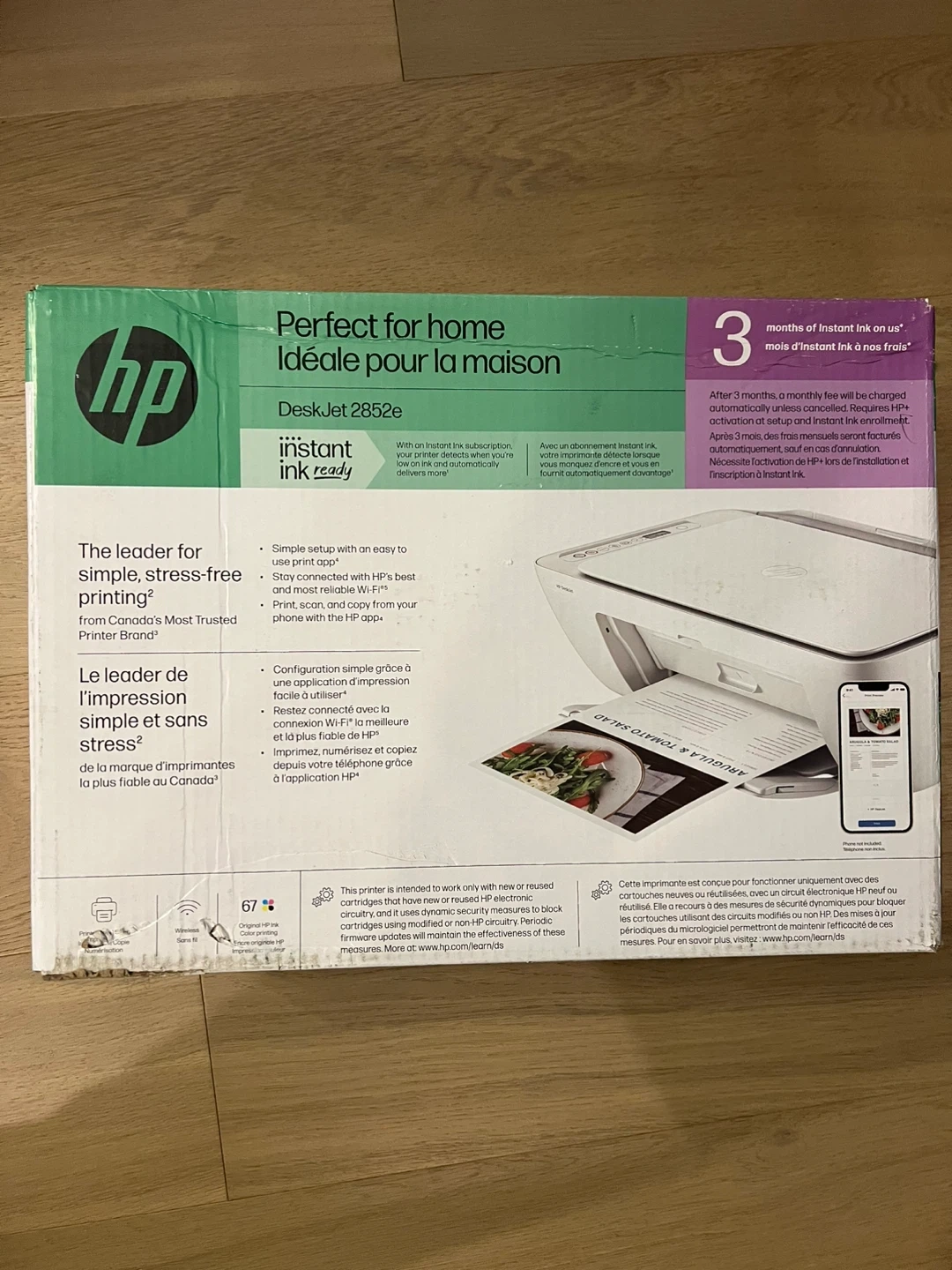 Selling an HP DeskJet 2852e all-in-one printer! It's in great shape and ready to go. Perfect for home or small office use. It comes with the box (Open Box). No ink