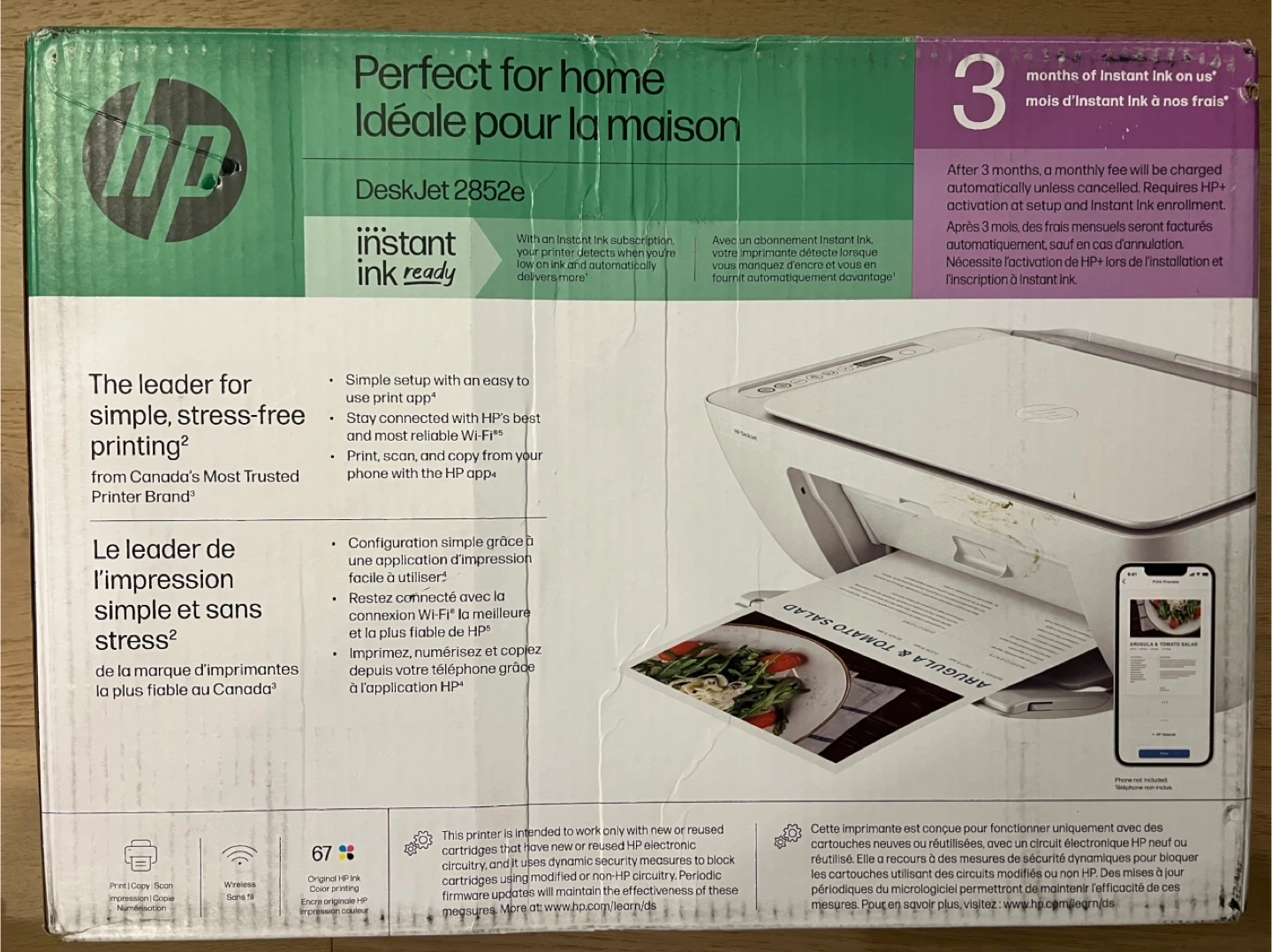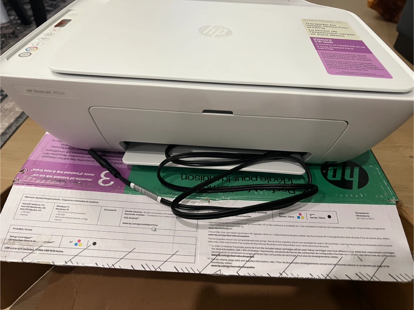 Selling an HP DeskJet 2852e all-in-one printer! It's in great shape and ready to go. Perfect for home or small office use. It comes with the box (Open Box). No ink