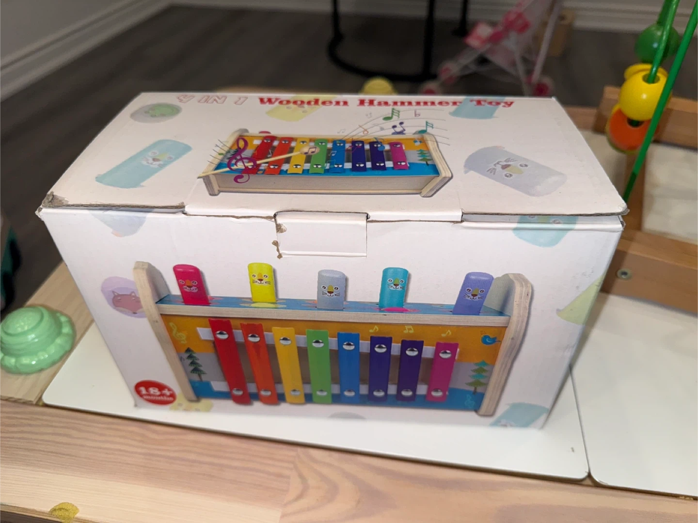 Selling a 4 in 1 wooden hammer toy that also includes a xylophone! It's in great condition and ready for a new home. The box is included!