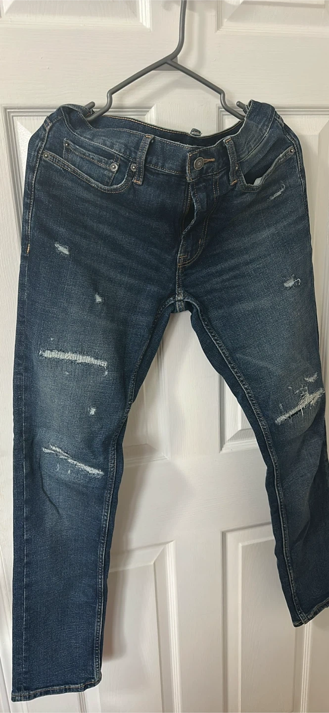 Dark wash denim jeans with a bit of distressing. They're in good condition and ready for a new owner