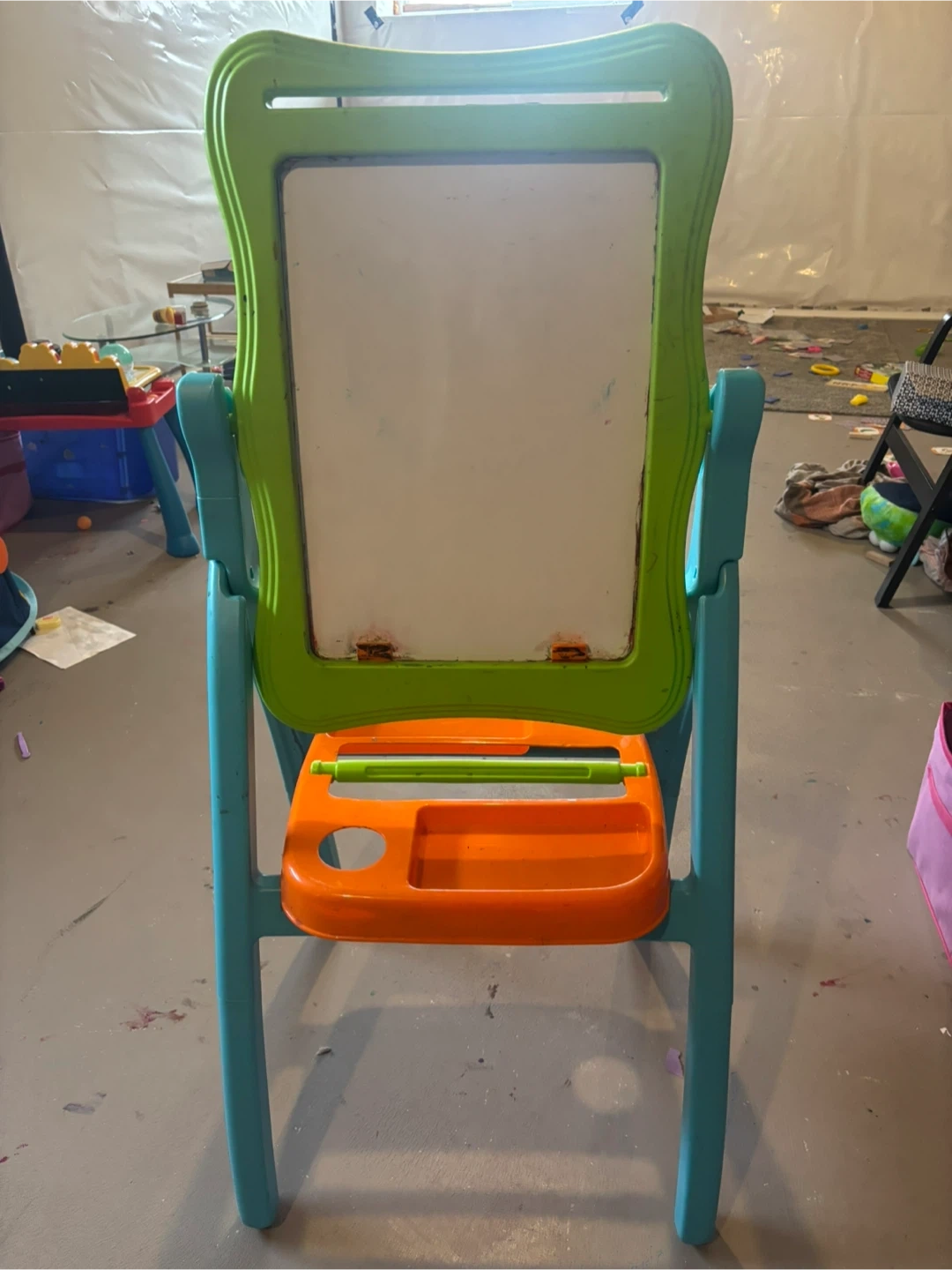 This Little Tikes double easel is perfect for your little artist! It features both a chalkboard and a whiteboard, so your child can explore different mediums. The easel is in good condition and ready for a new home filled with creativity and fun. It has some markers markings on the side but is fine otherwise.
