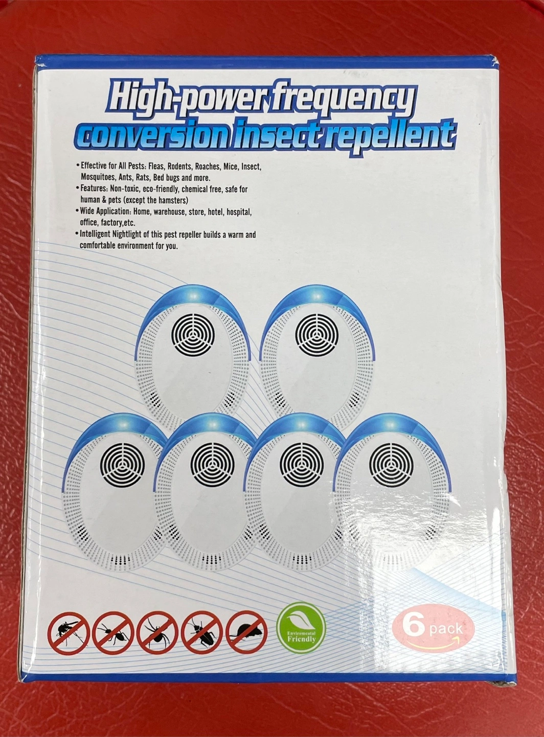 Get rid of those pesky pests with this high-power frequency conversion insect repellent! This 6-pack is effective for fleas, rodents, roaches, mice, insects, mosquitoes, ants, rats, bed bugs, and more. It's non-toxic, eco-friendly, and chemical-free, making it safe for humans and pets (except hamsters). Great for home, warehouse, store, hotel, hospital, office, or factory use. It even has an intelligent nightlight to build a warm and comfortable environment
