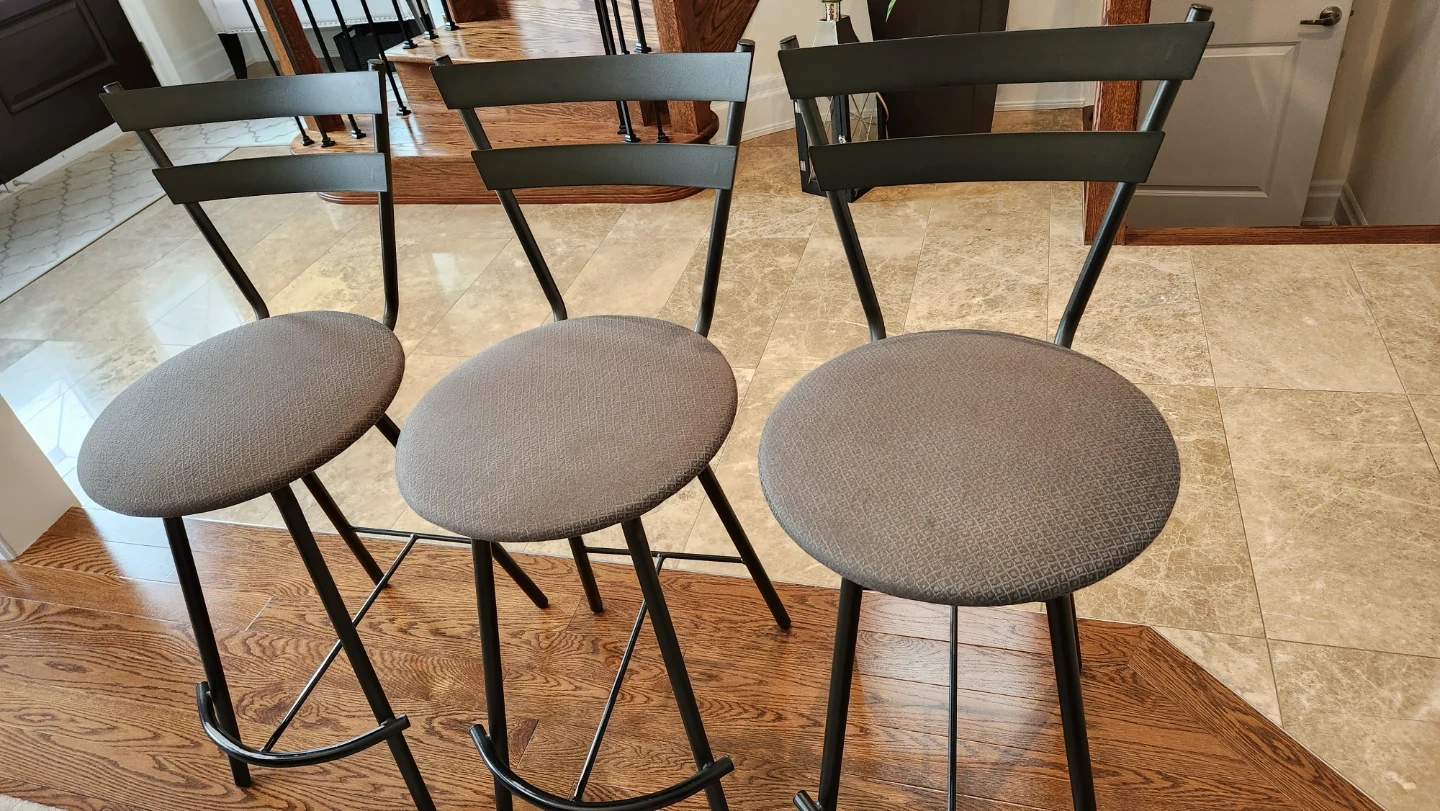 Selling a set of three bar stools. They have a simple, modern design with dark metalik metal frames and round, upholstered seats in a neutral colour. Perfect for a kitchen island or home bar!