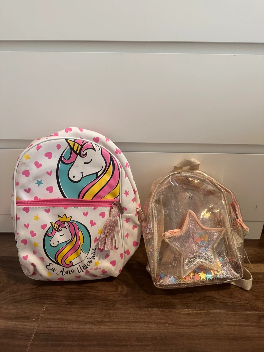 Two adorable mini backpacks for kids! One is white with a cute unicorn design and the other is a sparkly clear backpack with a star. They're both in good condition and ready for a new adventure