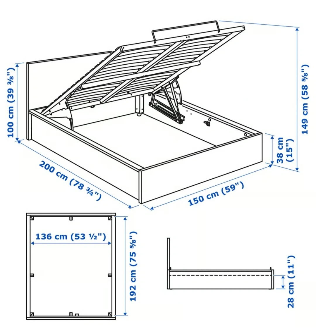 Selling a Queen size IKEA Malm ottoman bed frame in white. It's in great condition and offers convenient storage underneath. Dimensions are 200 cm (78 3/4") x 150 cm (59"). The headboard height is 100 cm (39 3/8") and the overall height is 149 cm (58 5/8")