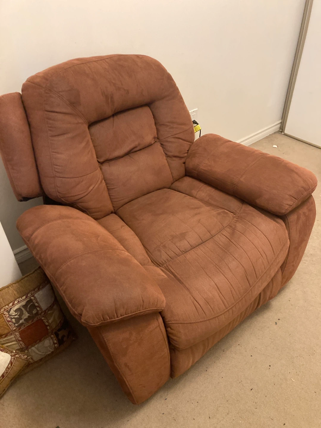 Comfortable brown recliner chair. It's in good condition and ready for a new home! Perfect for relaxing after a long day. The left backboard is broken inside.
