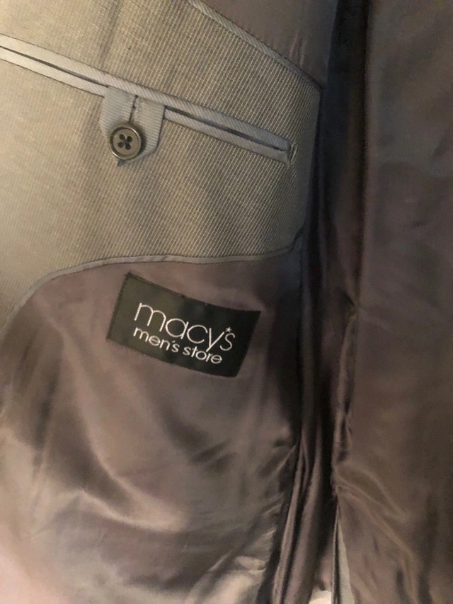 This is a Michael Kors suit size 50R with a stylish grey pinstripe, perfect for business or formal occasions. The suit is brand new with the original tags still attached, indicating a retail price of $400. The tag reads: RETICKET TAG UNC 008-25063/0783 SUIT S/WHATS DEPT 507 CLASS 22 VENDOR 961 STYLE 11031 GL/GL TKT 400.00. Given it's straight from Macy's Men's Store, it's looking for a new home and a fresh start! If the ad is up, it's up for grabs!