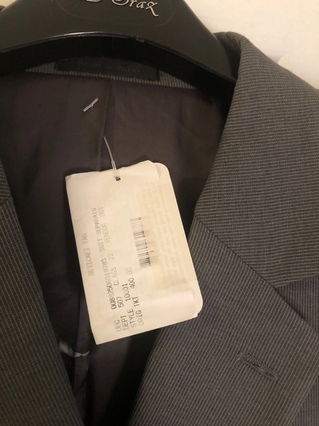 This is a Michael Kors suit size 50R with a stylish grey pinstripe, perfect for business or formal occasions. The suit is brand new with the original tags still attached, indicating a retail price of $400. The tag reads: RETICKET TAG UNC 008-25063/0783 SUIT S/WHATS DEPT 507 CLASS 22 VENDOR 961 STYLE 11031 GL/GL TKT 400.00. Given it's straight from Macy's Men's Store, it's looking for a new home and a fresh start! If the ad is up, it's up for grabs!