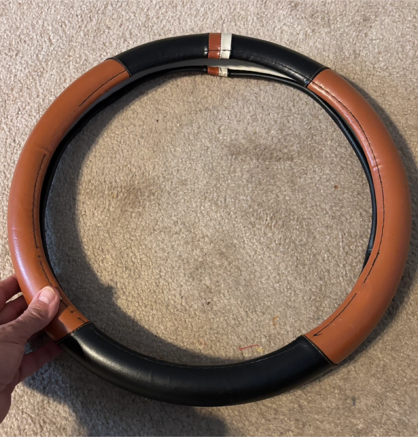 Selling a steering wheel cover in brown and black. It's in great condition and ready to add a touch of style to your ride!