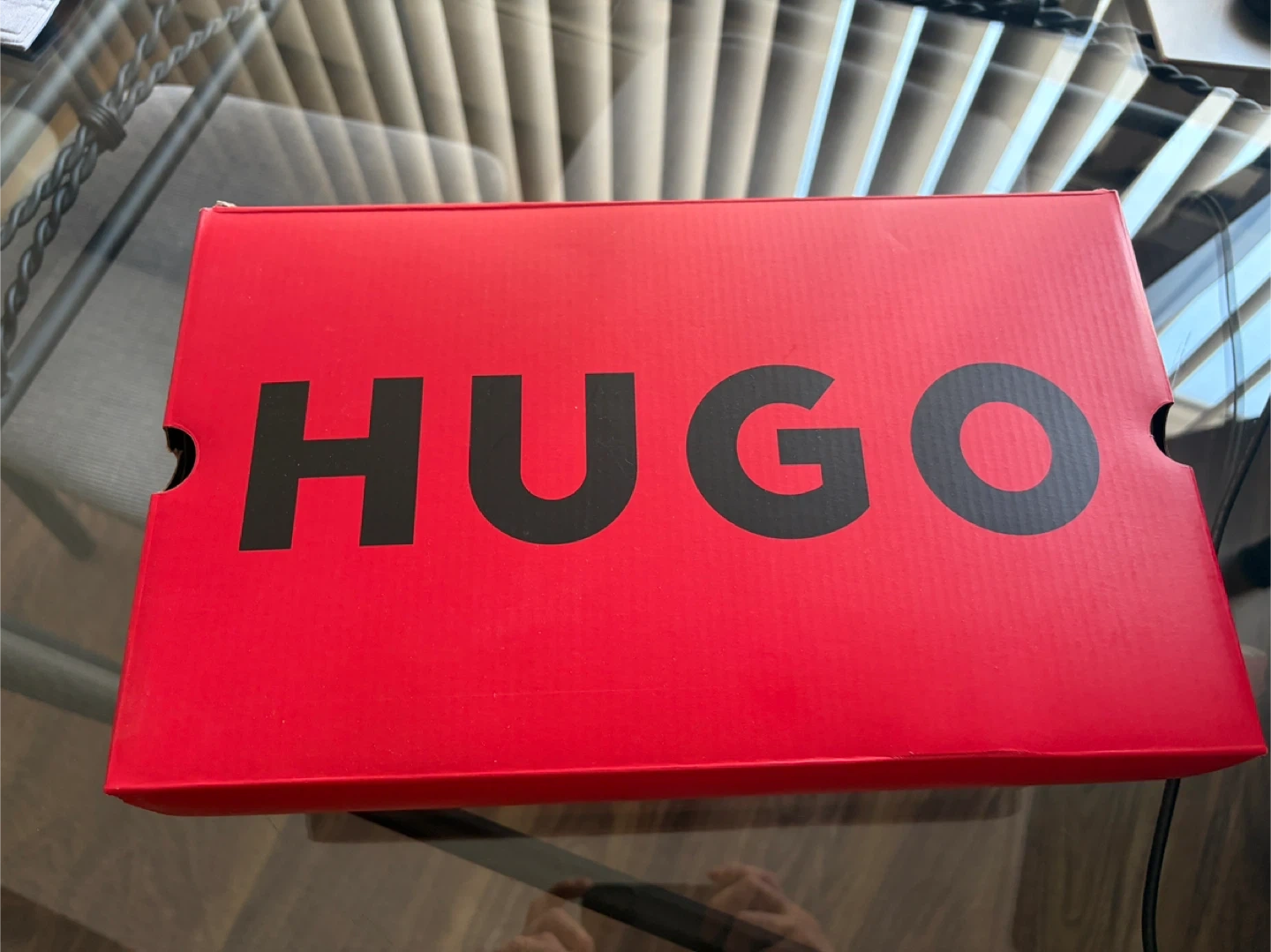 Selling a pair of Hugo men's sneakers in black, size 11-11.5. They come with the original box. These stylish sneakers are perfect for everyday wear. Size does not fit.