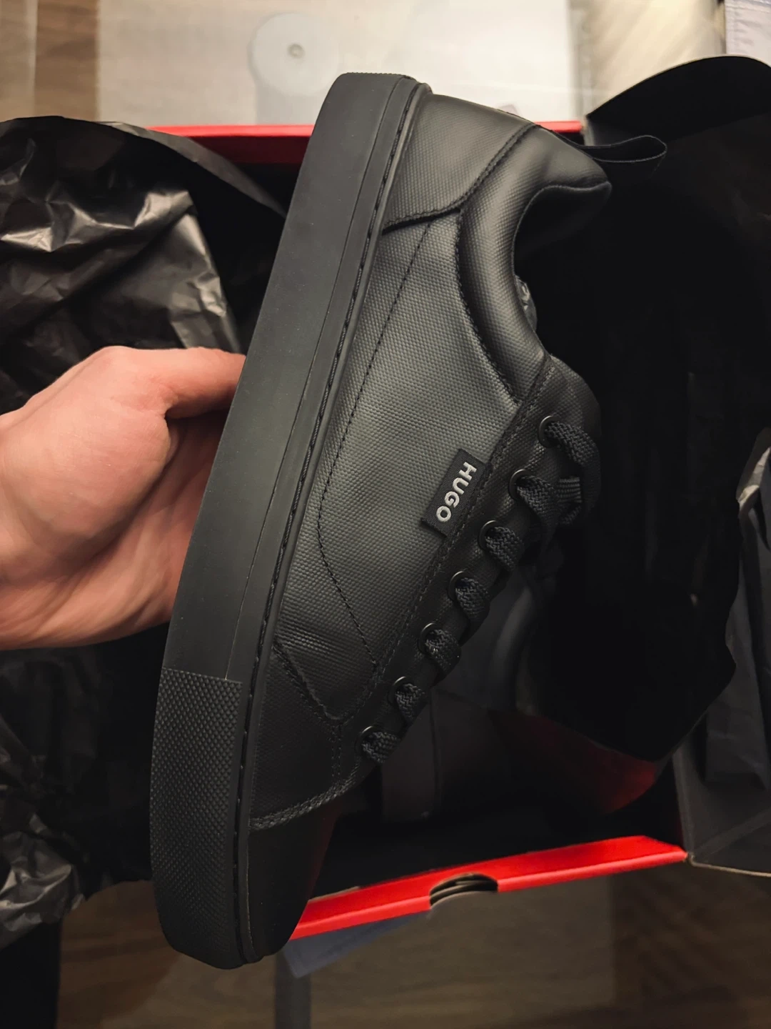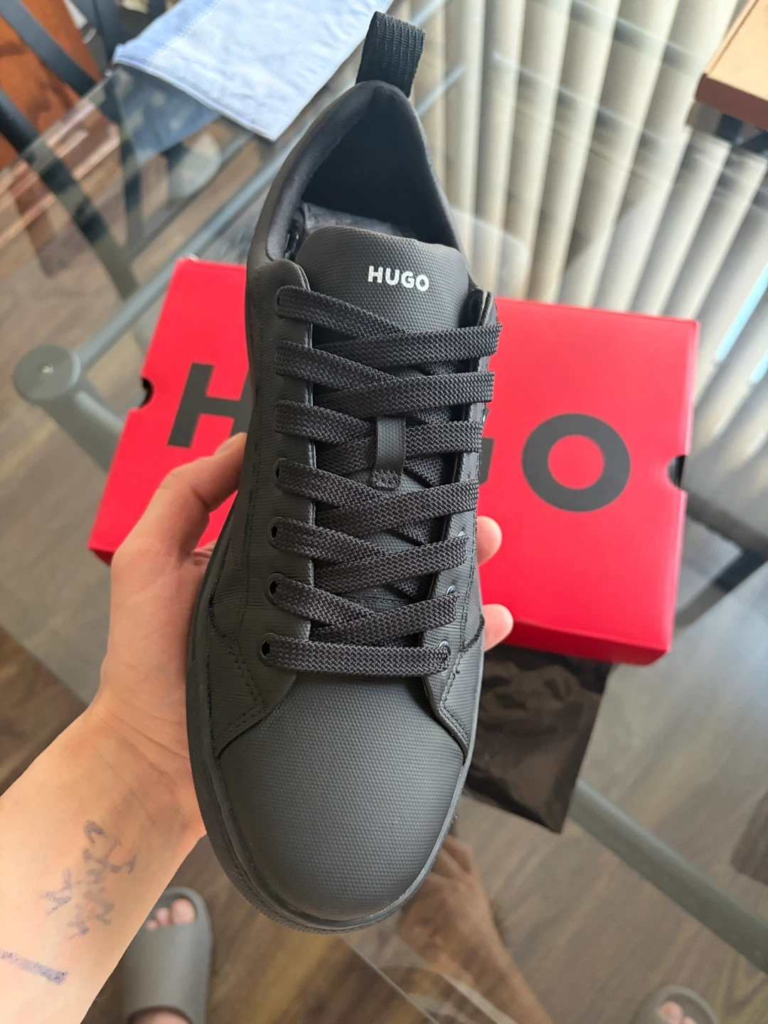 Selling a pair of Hugo men's sneakers in black, size 11-11.5. They come with the original box. These stylish sneakers are perfect for everyday wear. Size does not fit.
