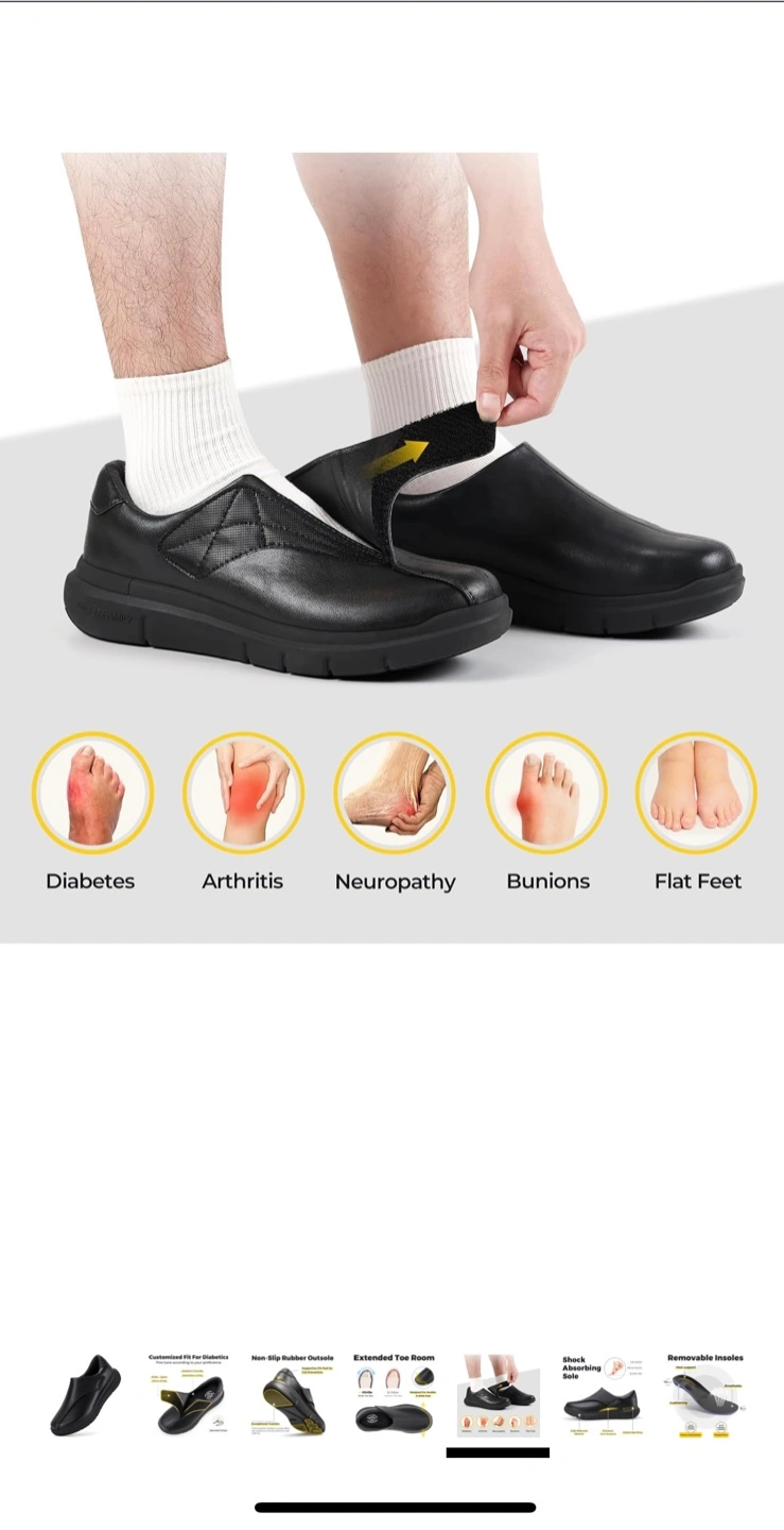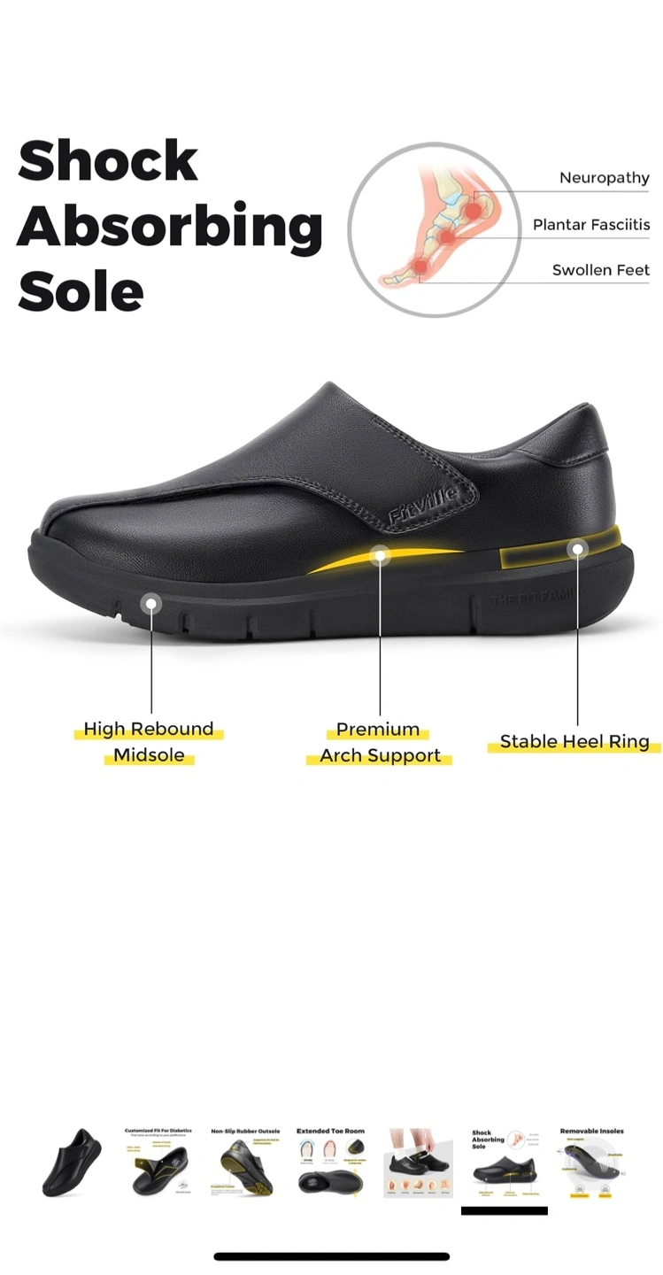 Looking to sell a pair of FitVille Diabetic Shoes in Jet Black, size 9 Wide. These shoes are designed for comfort and support, featuring a shock-absorbing sole and removable insoles. They're great for conditions like diabetes, arthritis, neuropathy, bunions, and flat feet. The shoes have an extended toe room and a non-slip rubber outsole for added safety and convenience